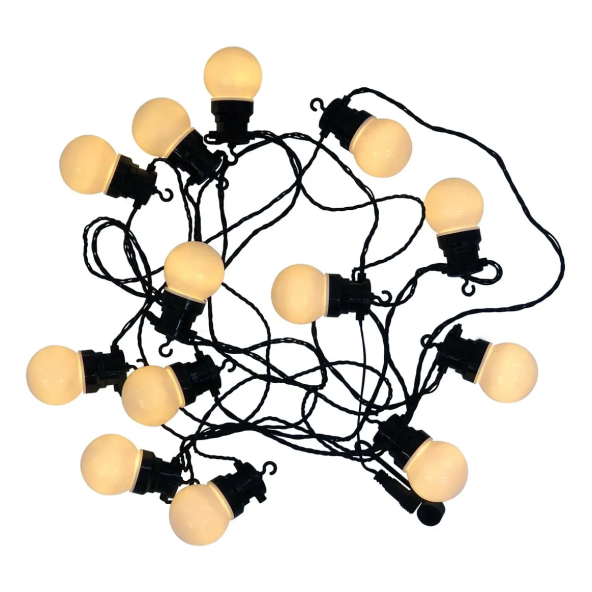 Stimmungsvolle LED Lichterkette für Außen mit warmweißer Beleuchtung. 10 runde Birnen (in jeder befinden sich 4 mini LEDs) sorgen für eine angenehme Atmosphäre. Die Lichterkette ist insgesamt 9,5 m lang, verteilt auf 5 m Anlaufschnur und 4,5 m Lichtschnur. Der Abstand zwischen den Birnen beträgt 50 cm.