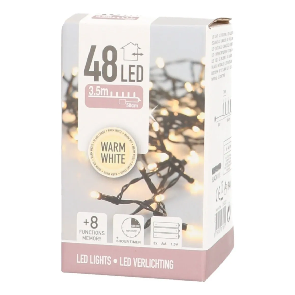LED-Lichterkette mit 48 Lämpchen, sowohl für den Gebrauch draußen als auch drinnen geeignet. Die Farbe der Lämpchen ist warm-weiß. Das Kabel ist ungefähr 4 m lang. Für den Betrieb werden AA-Batterien benötigt, die nicht inbegriffen sind.
