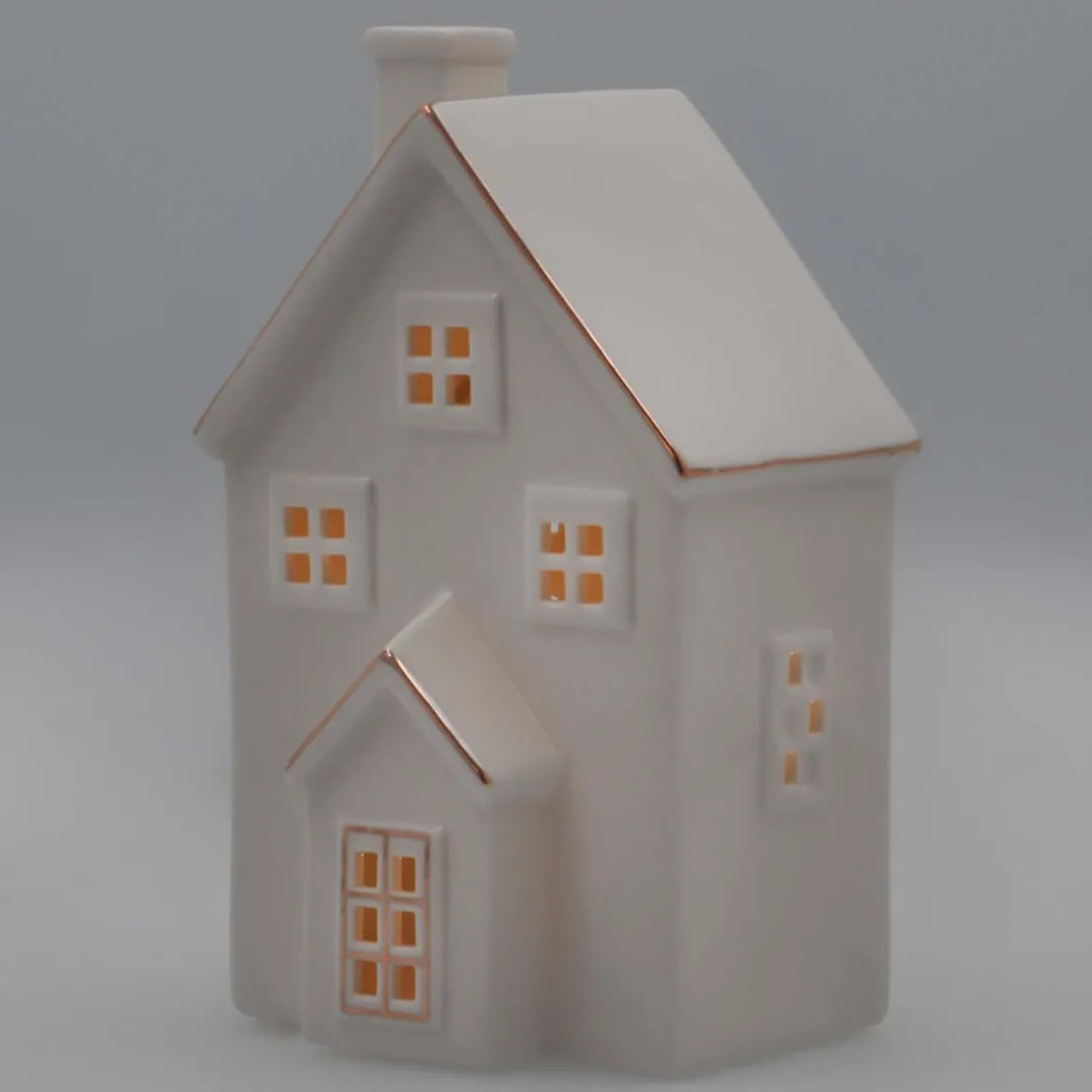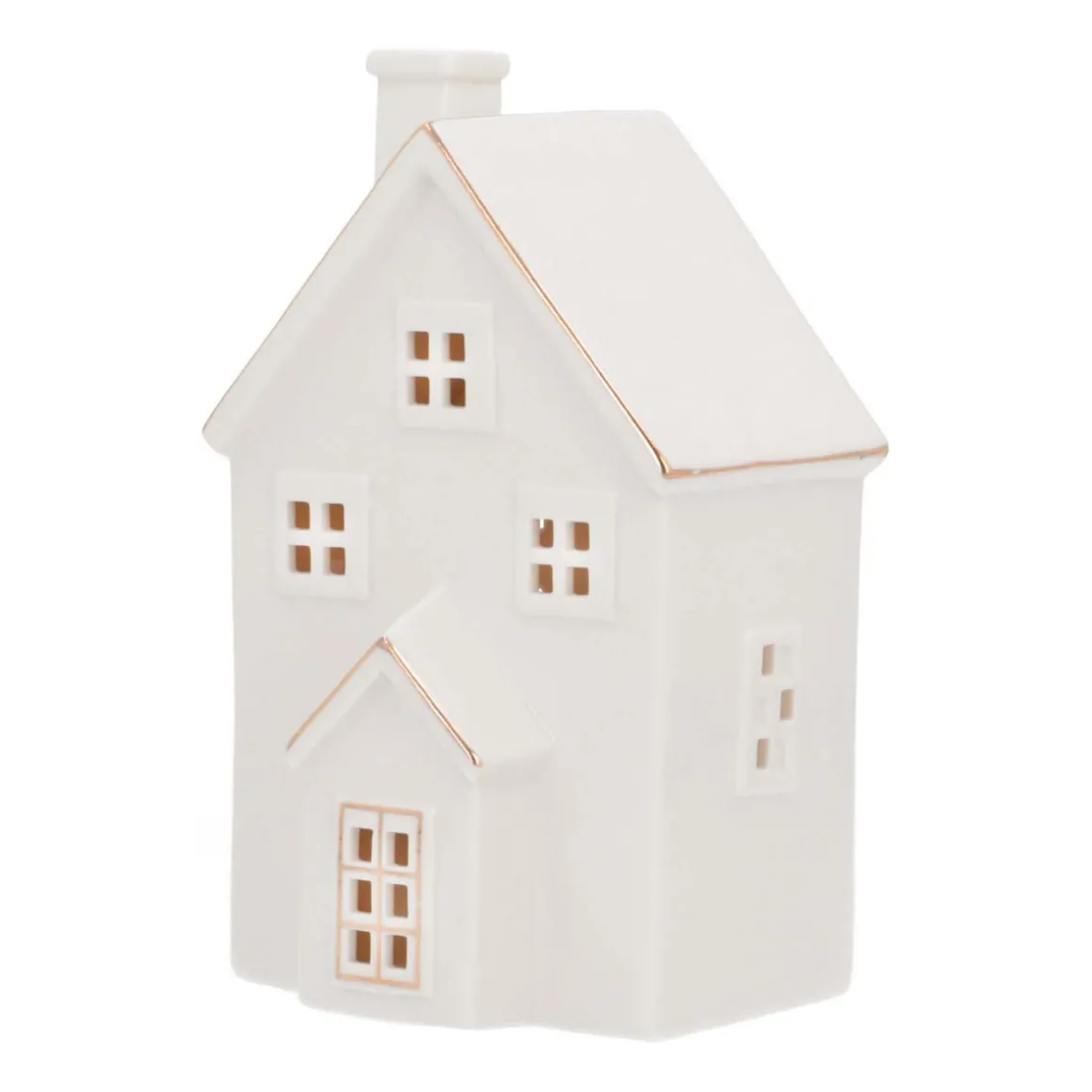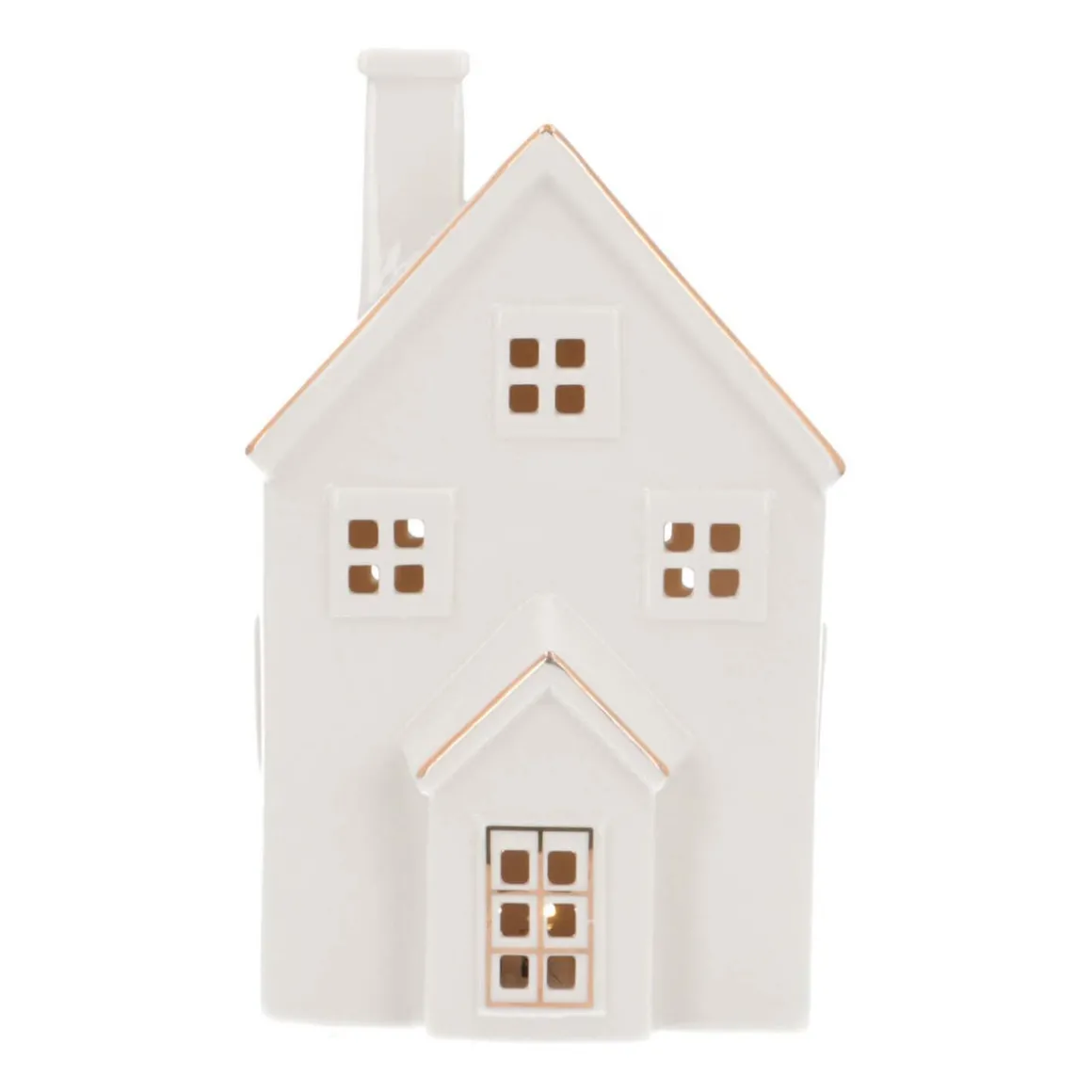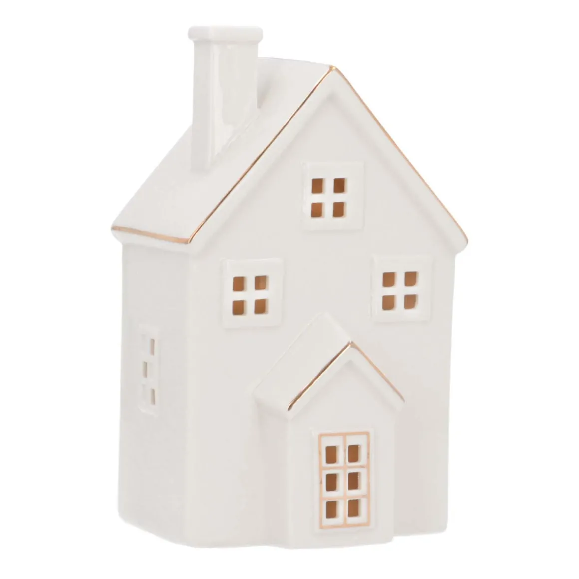 Stil trifft Ambiente. Mit diesem LED Lichthaus aus Porzellan holt ihr euch einen Eyecatcher in die Weihnachtsdeko, der zugleich eine gemütliche Atmosphäre kreiert. Dafür sorgt die warm-weiße LED-Beleuchtung im Inneren. Charakteristisch für dieses Haus sind der Erker im Erdgeschoss sowie die goldenen Linien an Dach und Fenstern. Das Haus ist 20 cm groß.