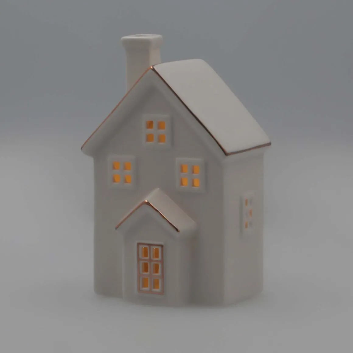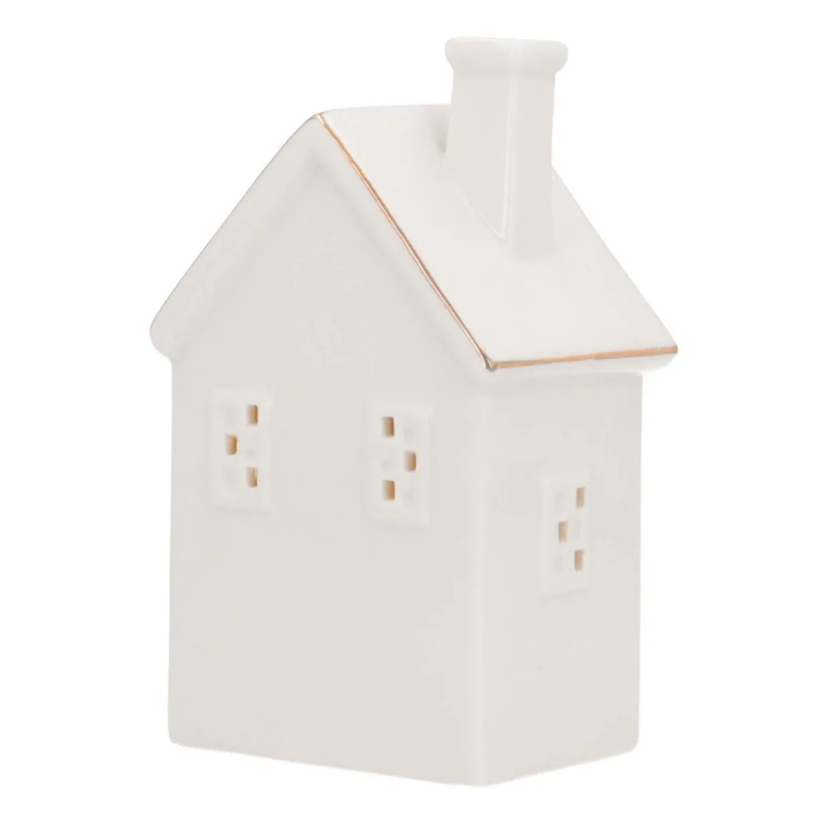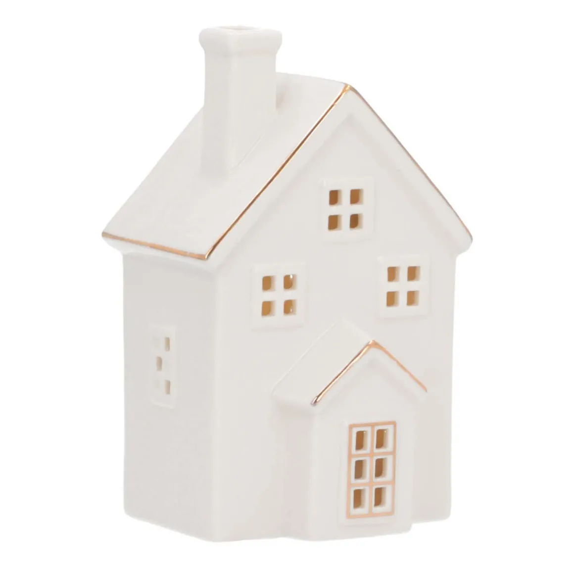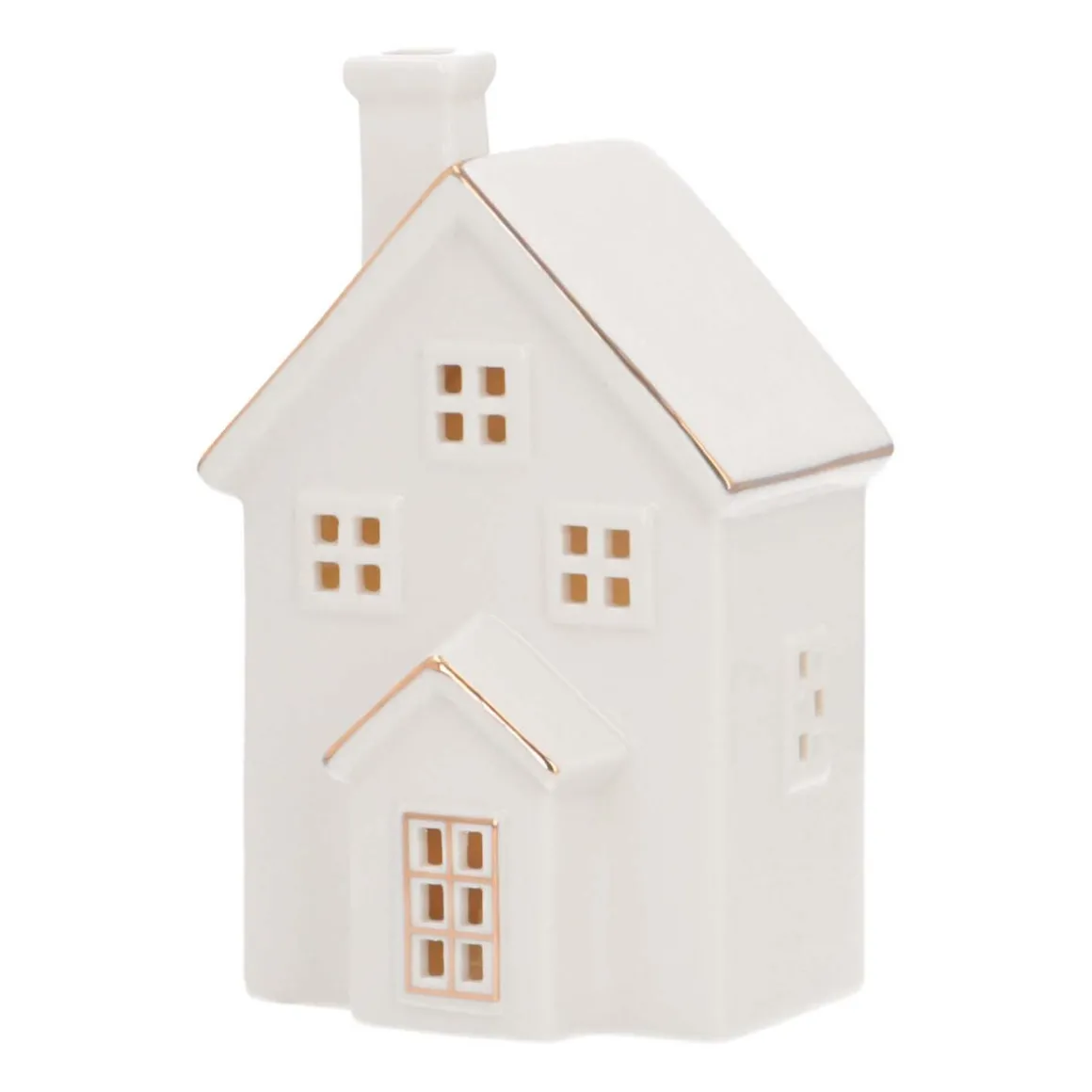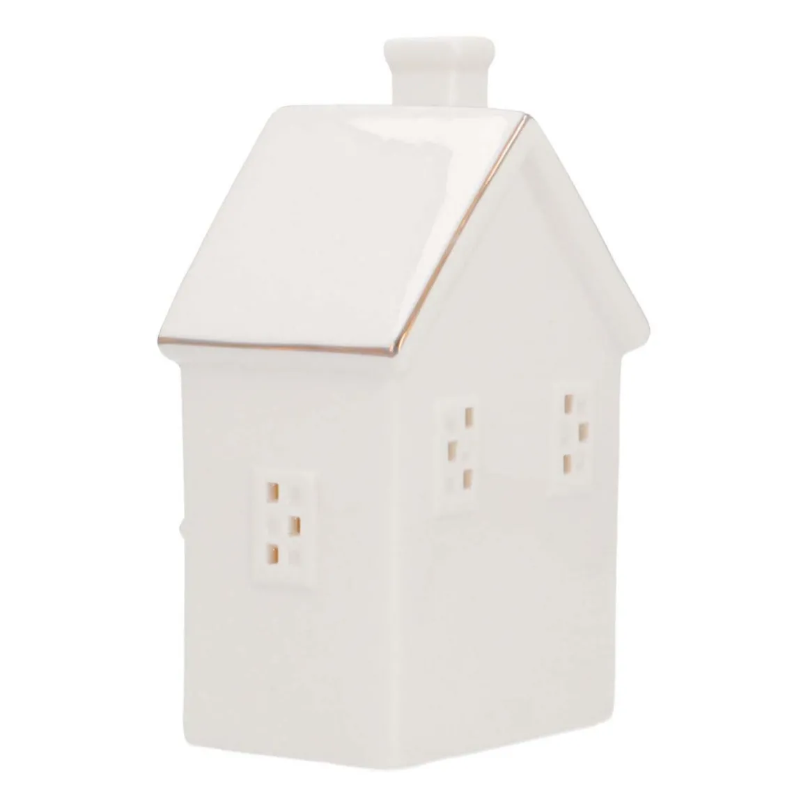 Stilvolles Ambiente mit einem Hauch von Magie. Dieses glänzende Porzellan-LED-Lichthaus wird zu einem echten Blickfang in eurer Weihnachtsdekoration und schafft gleichzeitig eine behagliche Atmosphäre. Dies wird durch die warm-weiße LED-Beleuchtung im Inneren gewährleistet. Das charakteristische Merkmal dieses Hauses sind der Erker im Erdgeschoss sowie die goldenen Verzierungen an Dach und Fenstern. Das Haus hat eine Höhe von 16 cm.
