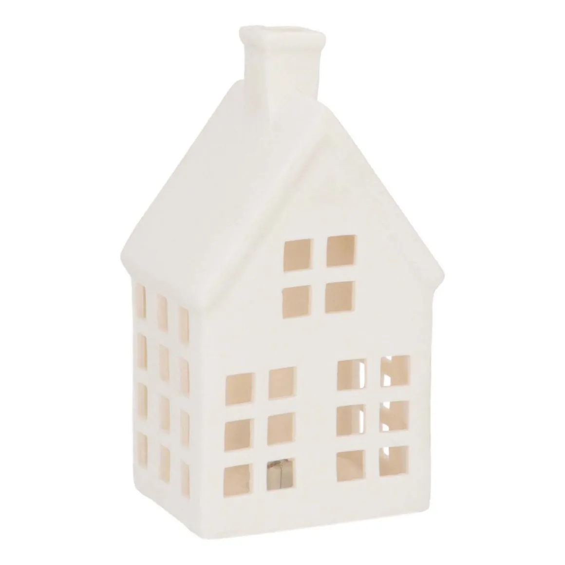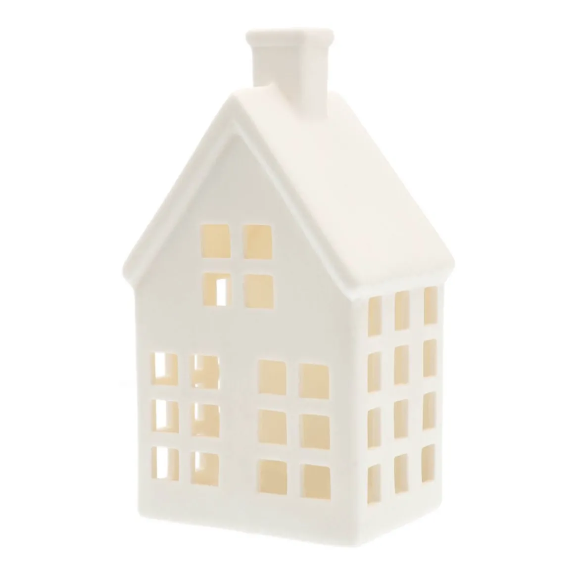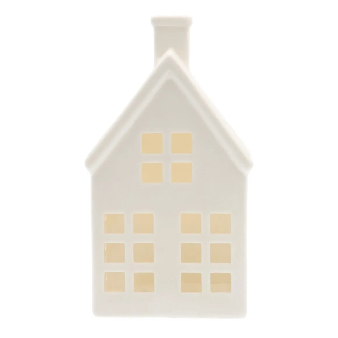 Modernes Lichthaus mit LED-Beleuchtung. Hergestellt aus Porzellan, mit warm-weißer LED-Farbe und einer Größe von ca. 11 cm. Perfekt als Weihnachtsdekoration auf der Fensterbank, dem Sideboard oder einem Tisch.