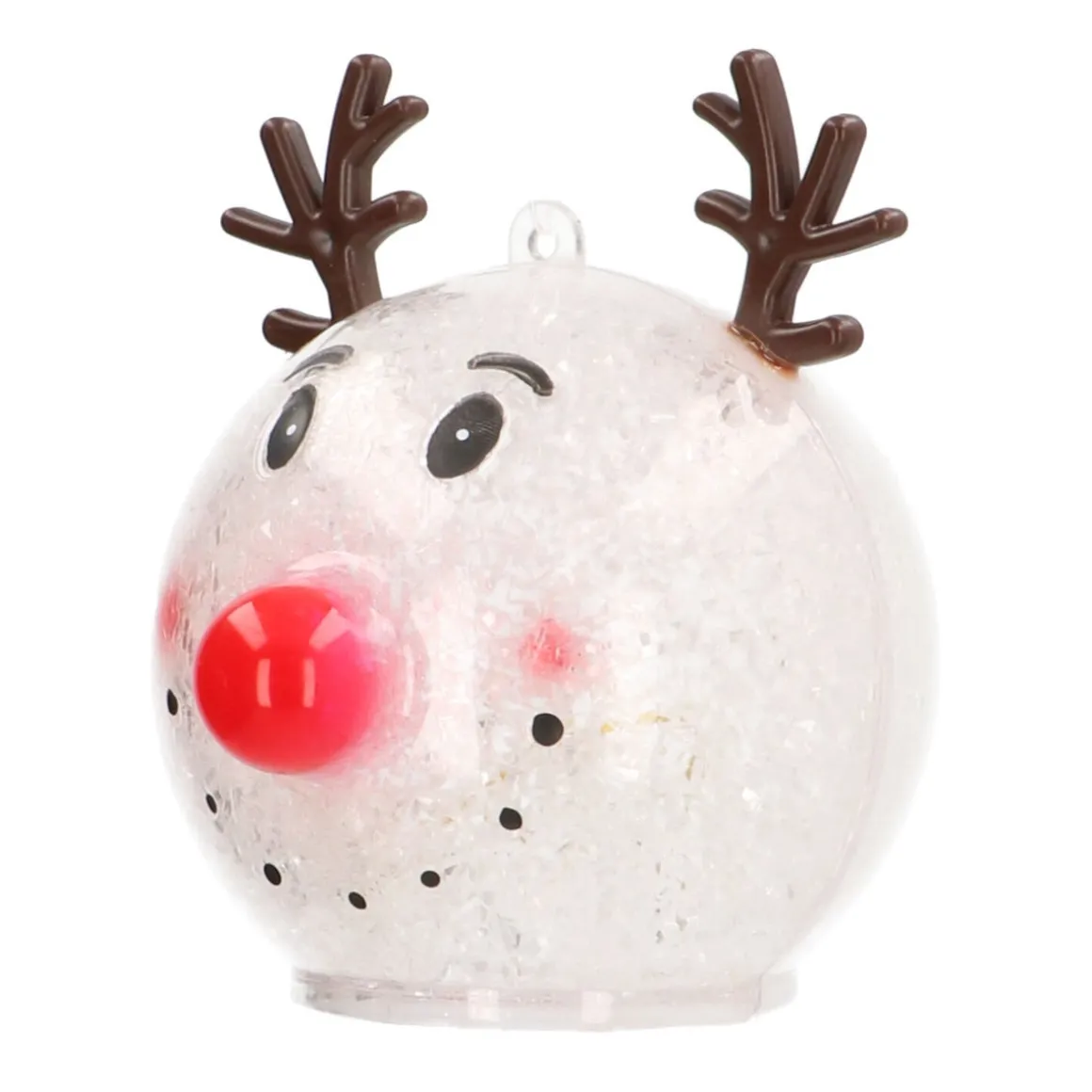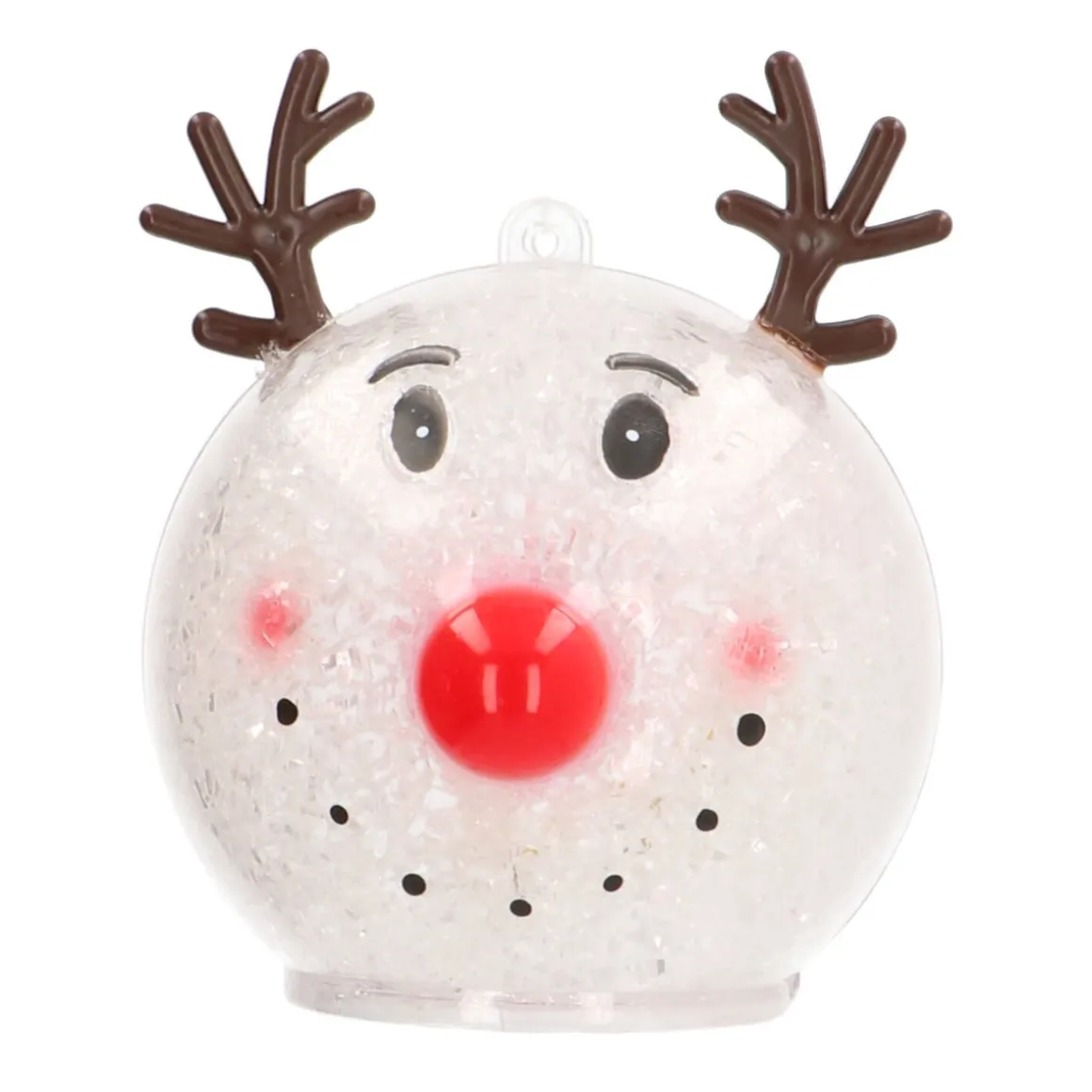 Rentier Weihnachtskugel mit LED beleuchteter, roter Nase. Aus Acryl hergestellt, 8 cm groß. Das fröhliche Rentier sorgt für eine besondere Atmosphäre und ist dazu ein niedlicher Hingucker. Es wirkt sehr gut bei traditionellen Weihnachtsdekorationen. Zugleich ist die Rentier Weihnachtskugel ein schönes Geschenk, denn es wird dem Beschenkten ein Lächeln auf die Lippen zaubern. Für die Beleuchtung sind 3 AG3 Knopfzellen-Batterien nötig, die im Lieferumfang enthalten sind.
