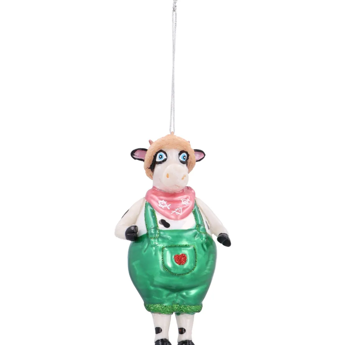 Dieser Glas-Kuh-Weihnachtsanhänger von 12 cm ist voller detailreicher Elemente: Die Kuh trägt einen Strohhut, ein rotes Halstuch mit Fischen und eine grüne Latzhose mit süßem Herzchen. Die witzigen und bunten Details dieser gefleckten Kuh werden sowohl Kinder als auch Erwachsene begeistern.