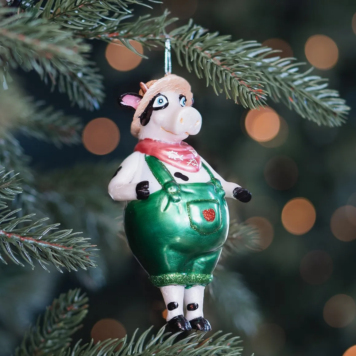 Bringe den ländlichen Charme des Bauernhofs in deinen Weihnachtsbaum mit dieser detailreichen Kuh in Latzhose. Perfekt für Kuhliebhaber und stolze Bauern!