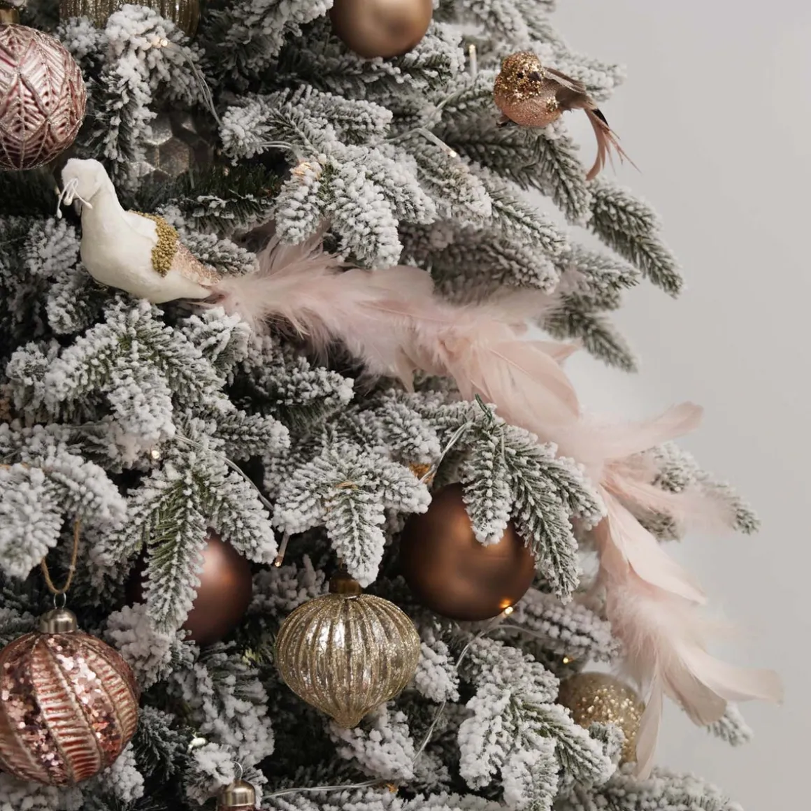 Verzaubert eure Wohnräume mit unserem weißen Pfau, geschmückt mit champagnerfarbenen Perlen und einem opulenten Federkleid, in eine Oase der Eleganz. Seine echten Federn in zartem Rosa und der kunstvolle Kunststoff-Körper strahlen unvergleichlichen Glamour aus. Mit imposanten 50 cm Größe avanciert er zum Höhepunkt eurer Weihnachtsdekoration. Durch die praktische Clip-Befestigung kann er mühelos an Zweigen angebracht werden.