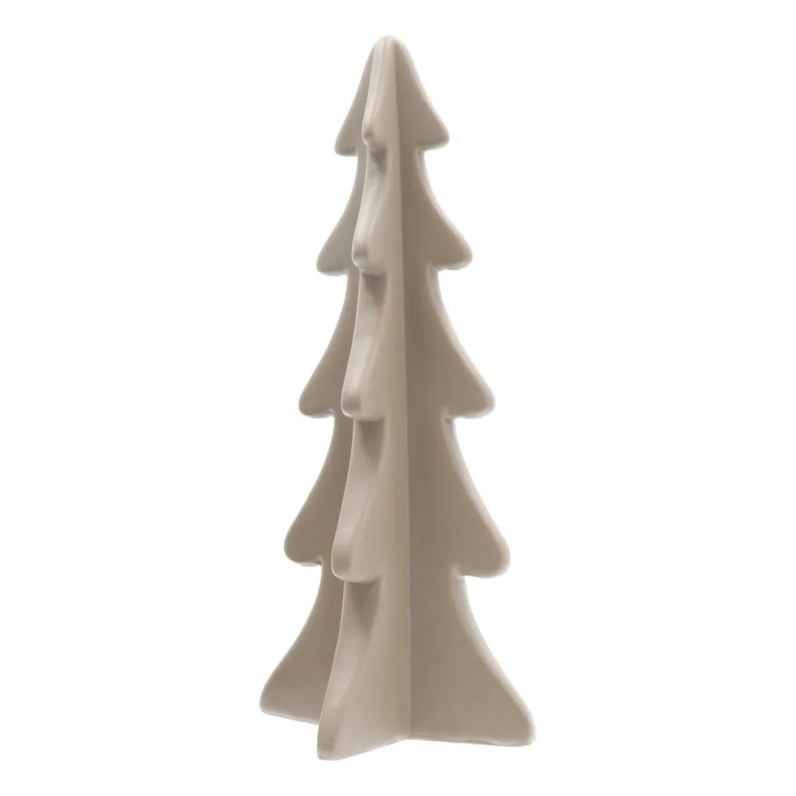 Moderner Deko-Tannenbaum aus Porzellan. Die Tanne hat eine matt-taupefarbene Oberfläche und ist circa 28 cm groß. Mit ihrem schlichten, eleganten 3D-Design eignet sie sich wunderbar zur Weihnachtsdeko auf Tisch oder Fensterbank.
