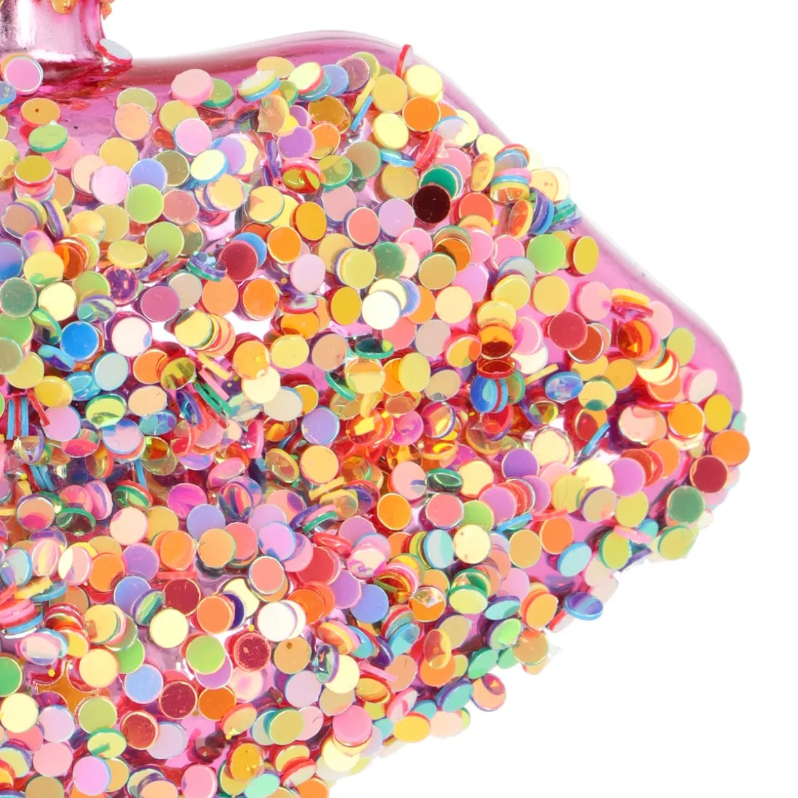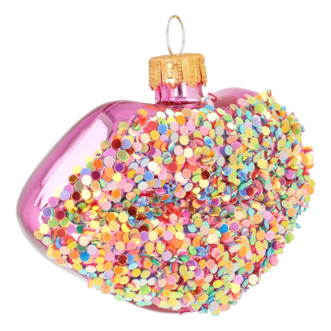 Dieser handgefertigte gläserne Weihnachtsschmuck ist mit fröhlichen Disco-Sprenkeln übersät, die im Licht der Weihnachtsbeleuchtung reflektieren. Zusammen mit der leuchtenden Farbe und der breiten Abmessung von 10 cm fällt dieser rosa Mund in deinem Weihnachtsbaum garantiert auf.