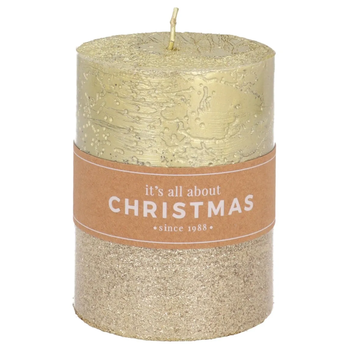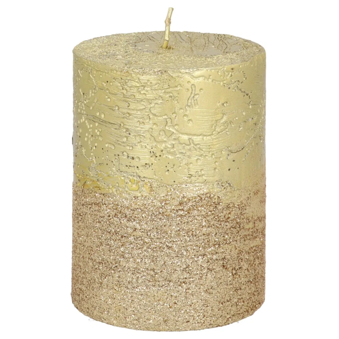 Besondere Stumpenkerze in Altgold, versehen mit einem angesagten Metallic-Look sowie Glitzer-Sand-Effekt. Die Kerze ist 10 cm groß und hat einen Durchmesser von 7,5 cm, womit sie für gängige Kerzenhalter geeignet ist. Bei einer Brenndauer von ungefähr 50 Stunden lässt sich von ihrem Kerzenlicht länger genießen als bei Vergleichskerzen.