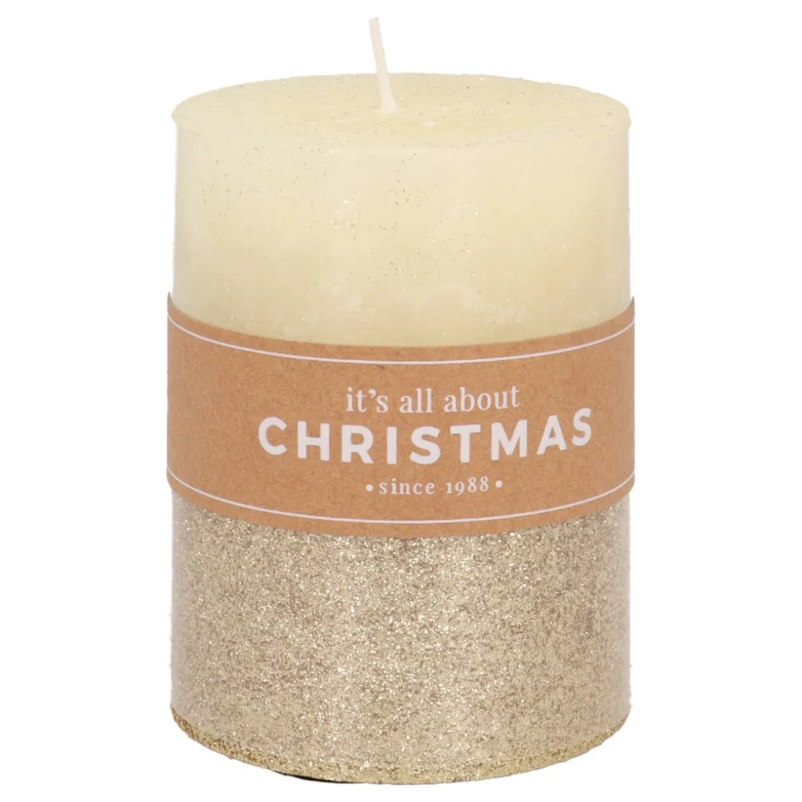 Elegante Stumpenkerze in -Elfenbein-Weiß, versehen mit goldenem Glitzer. Die Kerze ist 10 cm groß und hat einen Durchmesser von 7,5 cm, womit sie für gängige Kerzenhalter geeignet ist. Bei einer Brenndauer von ungefähr 50 Stunden lässt sich von ihrem Kerzenlicht länger genießen als bei Vergleichskerzen.
