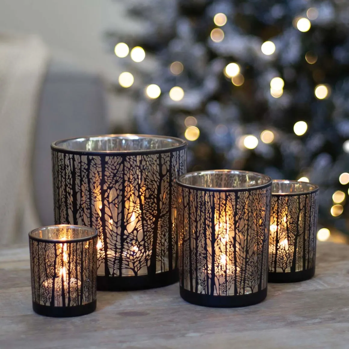 Außergewöhnlicher Teelichthalter aus hochwertigem Glas mit Wald-Musterung in Schwarz. Im Inneren ist das Windlicht antik-silber beschichtet. Durch seine besondere, teils transparente Oberfläche wirft der Kerzenschein ein einmaliges Muster an die Wand und sorgt für eine angenehme Atmosphäre. Zur Beleuchtung kann ein normales Teelicht oder ein Maxi-Teelicht verwendet werden. Das Glas ist 12,5 cm groß, bei einer Breite von circa 10 cm.
