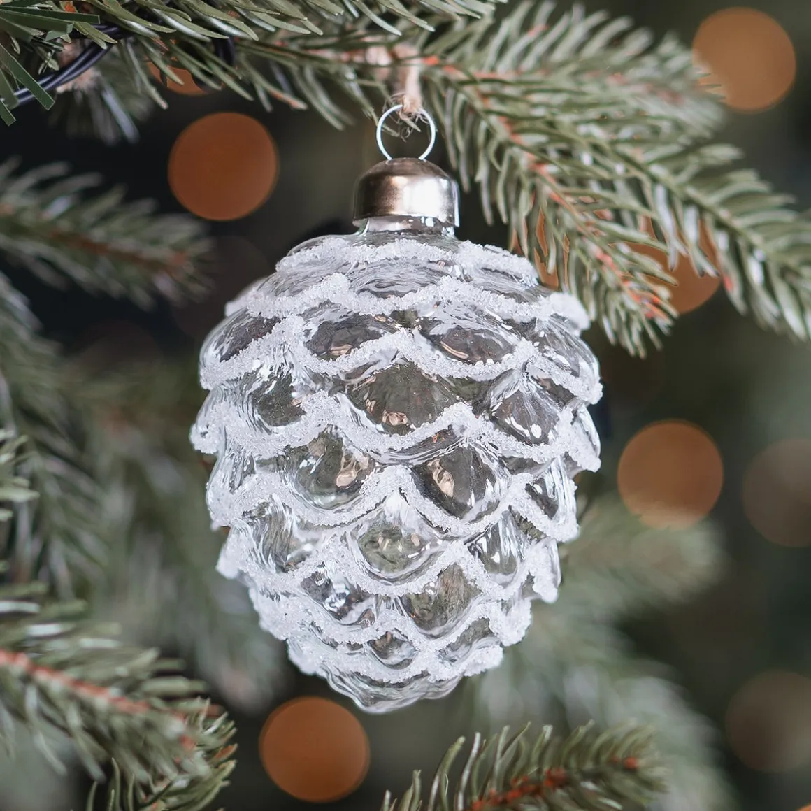 Kombiniere diesen eleganten Zapfen mit silbernen Weihnachtskugeln für einen stilvollen, hellen Weihnachtsbaum. Verwende zusätzliche transparente Weihnachtshänger, wenn du die luftige Atmosphäre noch mehr betonen möchtest. PS: Dieser Glaszapfen sieht auch wunderschön in Kombination mit hellen Pastelltönen aus!