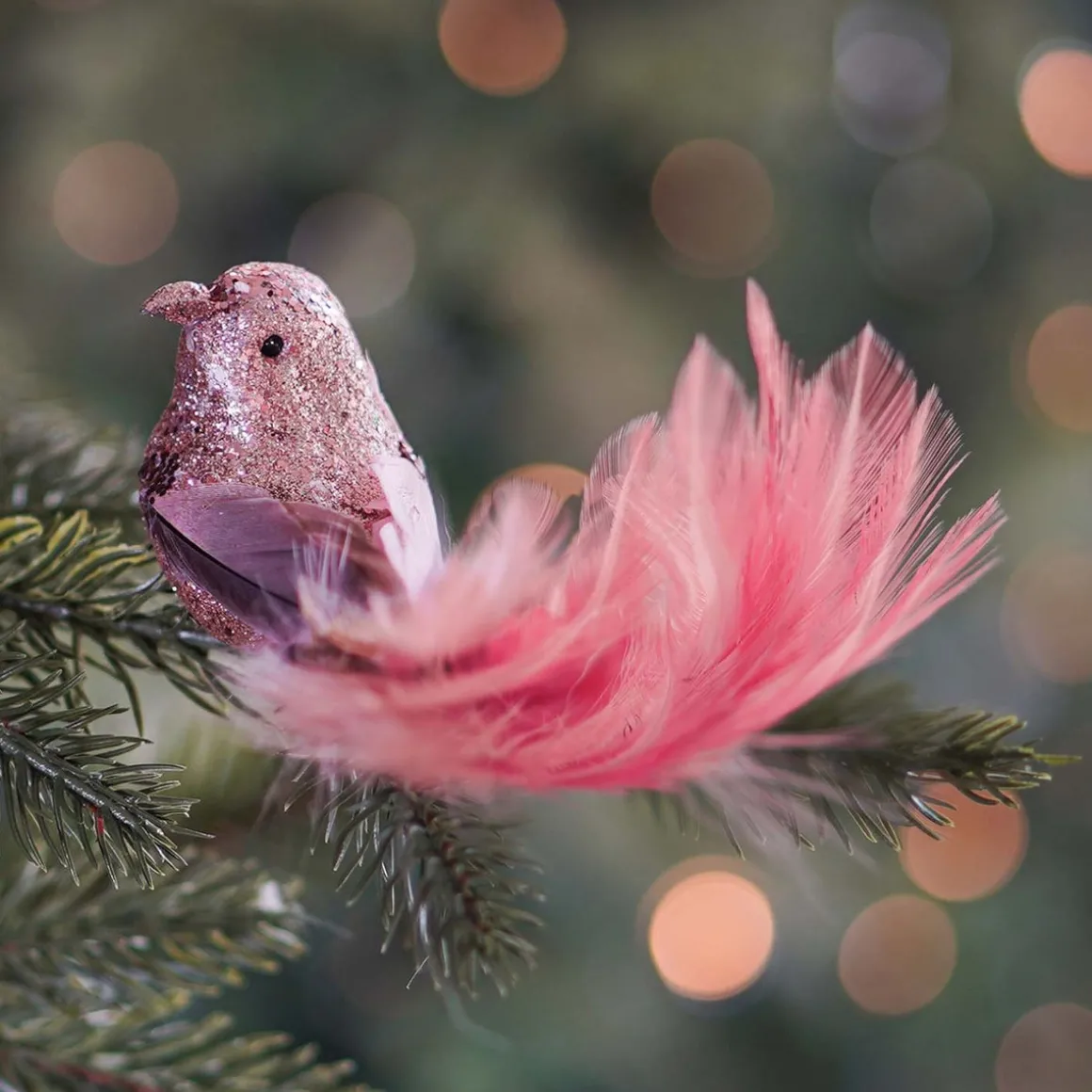 Dieser entzückende Vogel, ausgestattet mit einer praktischen Clip-Befestigung, verleiht eurer festlichen Weihnachtsdekoration eine zusätzliche Portion Eleganz. Sein Körper schimmert in lebhaftem Rosaton, ist kunstvoll mit glitzernden Akzenten verziert und punktet mit seinen echten Federn. Mit einer beachtlichen Größe von 18 cm bis zur Spitze seiner Federn ist sicher, dass dieser Vogel alle Augen auf sich ziehen wird.