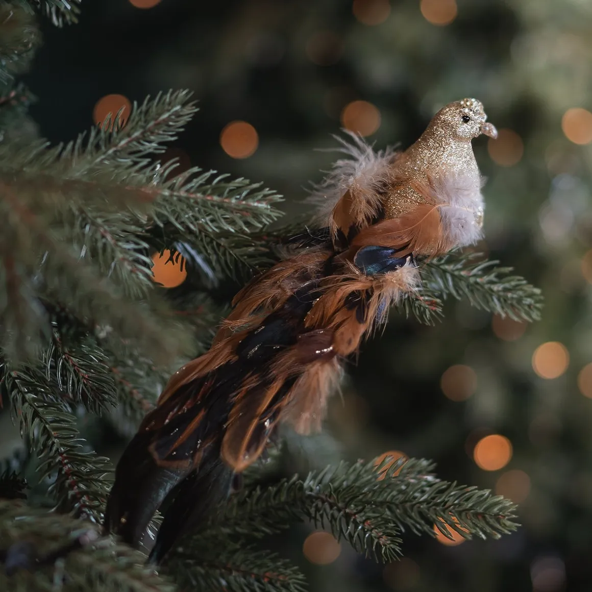 Mit seiner pompösen Feder und reichlich Glitzer weiß der luxuriöse Vogel mit Clip Eindruck zu hinterlassen und somit auch einen tollen Akzent in eurem Tannenbaum zu setzen. Sein Körper aus Kunststoff strahlt in hellgoldener Farbe, während die echten Federn einen bräunlichen Ton einschlagen. Ganze 30 cm misst der Vogel bis zur Federspitze.