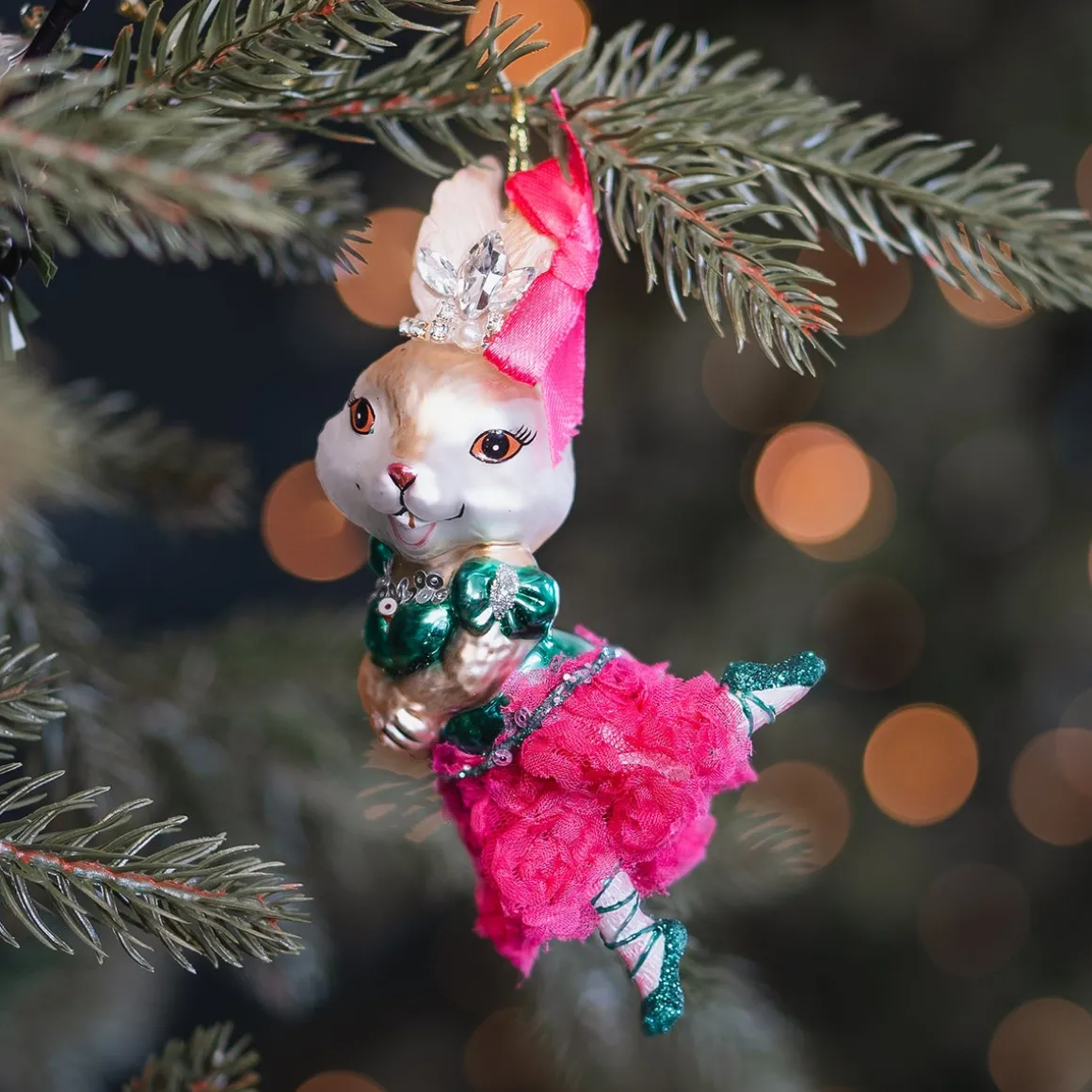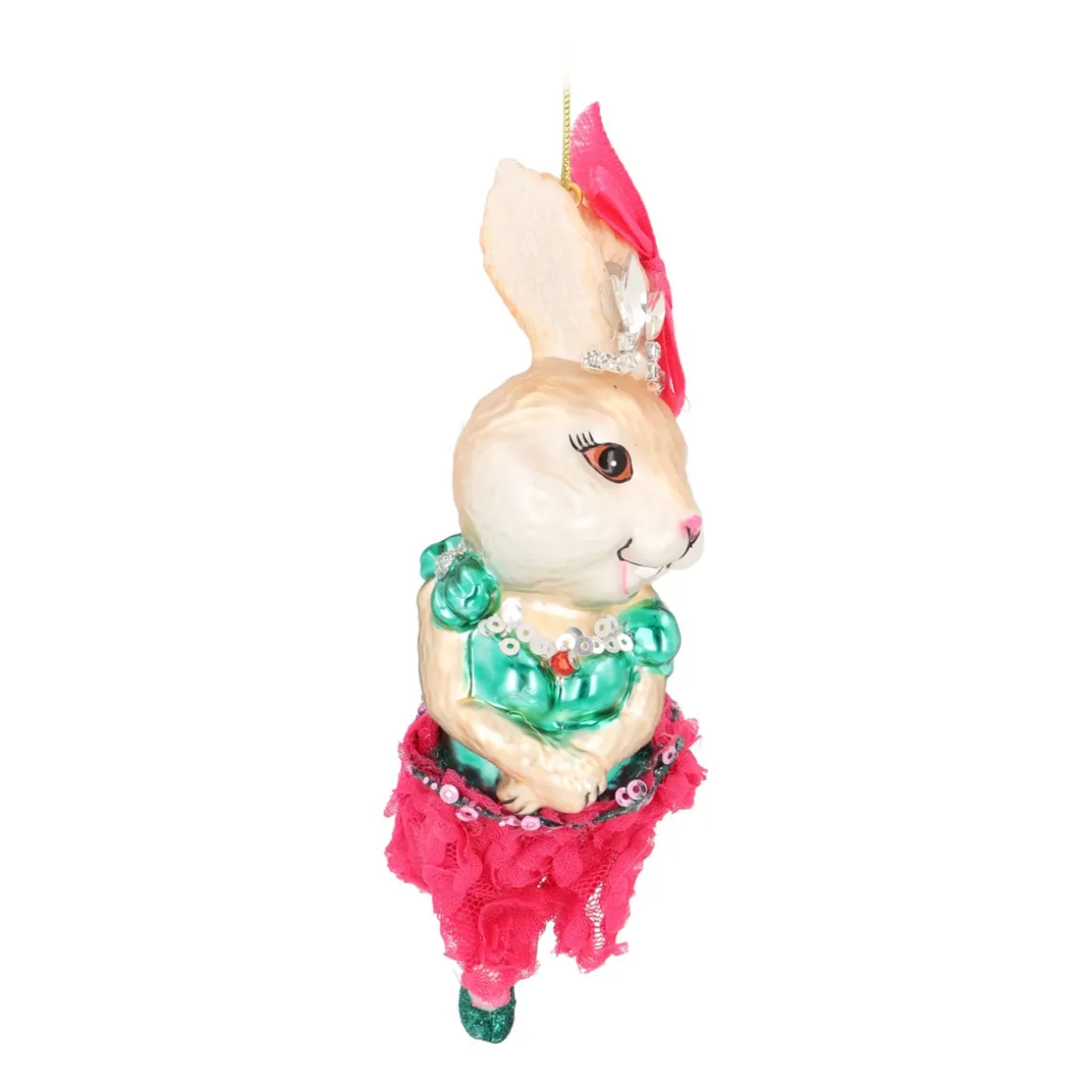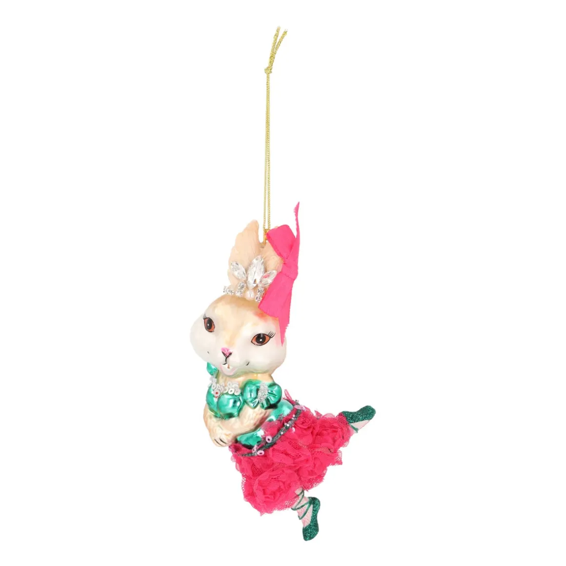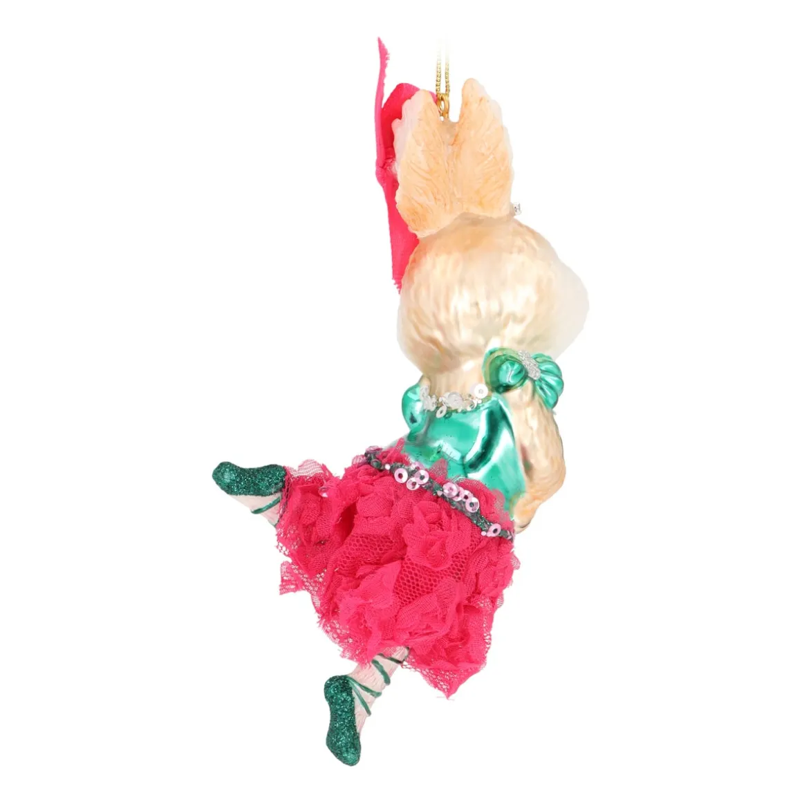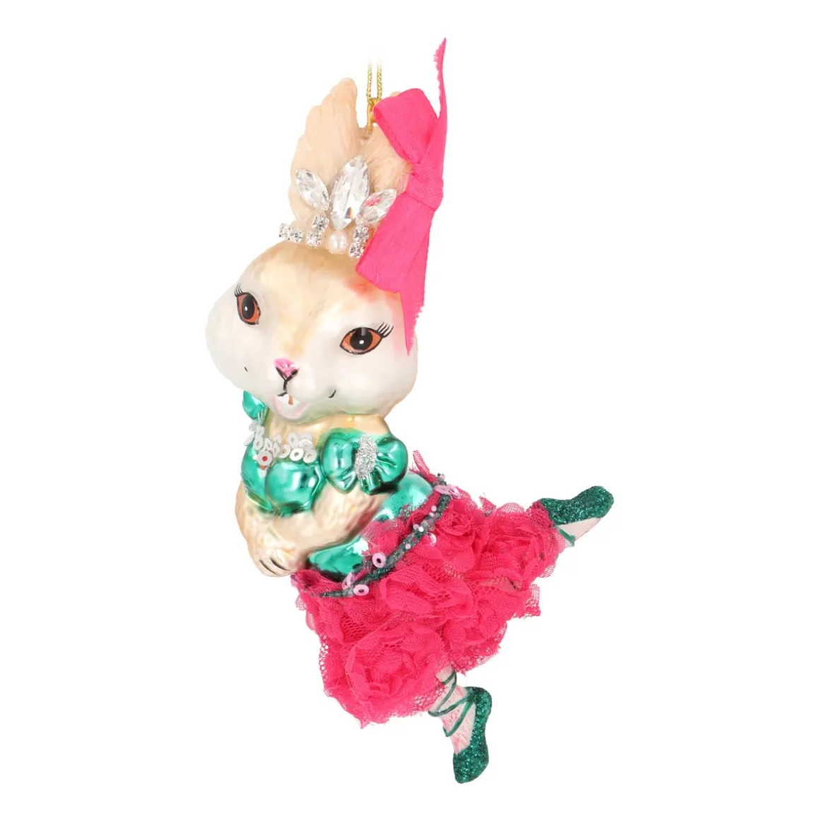 Dieser Glas-Weihnachtsanhänger in Form eines Kaninchens ist voller besonderer Details. Das niedliche Kaninchen trägt ein grünes Ballettkostüm mit passenden glitzernden Schühchen und einem rosa Spitzenröckchen mit Röschen. Die rosa Schleife und das funkelnde Krönchen aus echten Strasssteinen runden das Design perfekt ab. Der Anhänger ist 15 cm groß und fällt definitiv im Weihnachtsbaum auf. Mit der goldenen Aufhängeschlaufe kannst du die detailreiche Ballerina einfach in deinem Baum aufhängen.