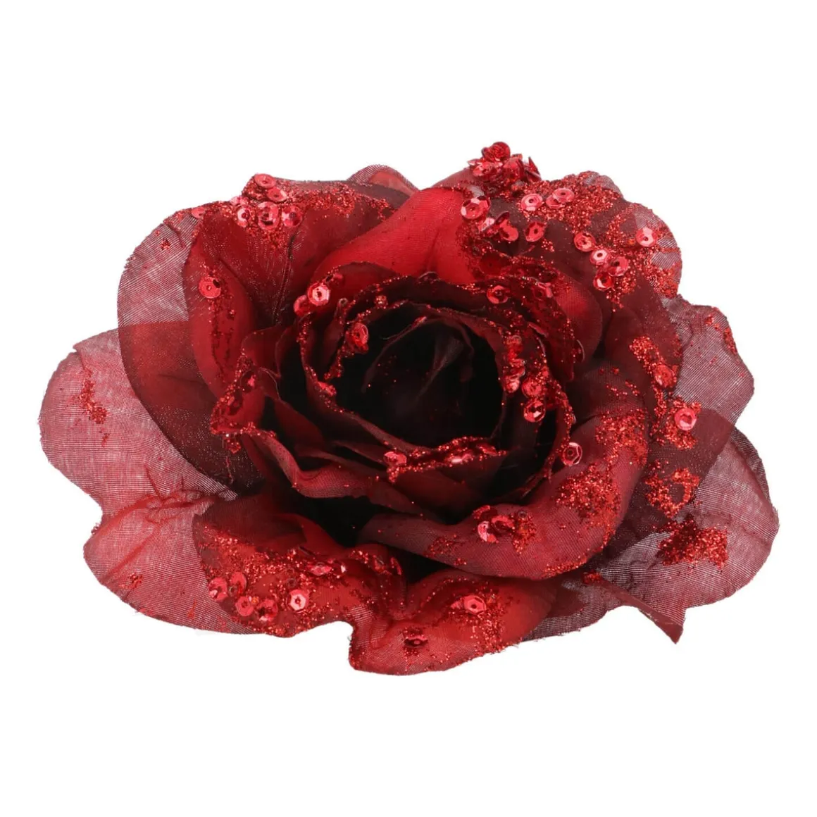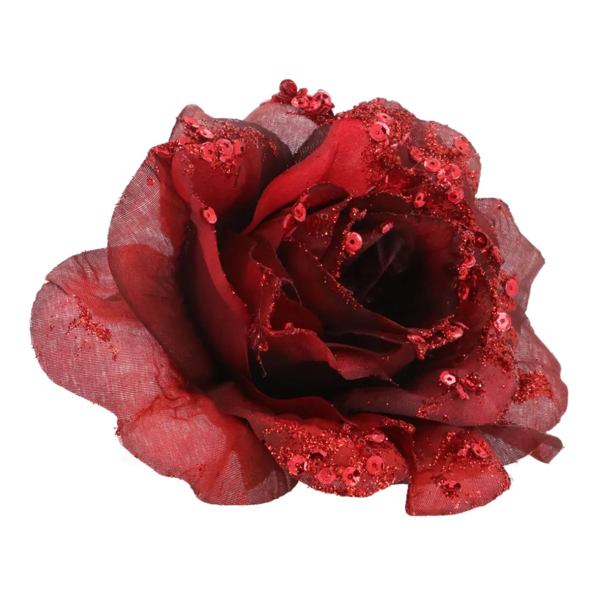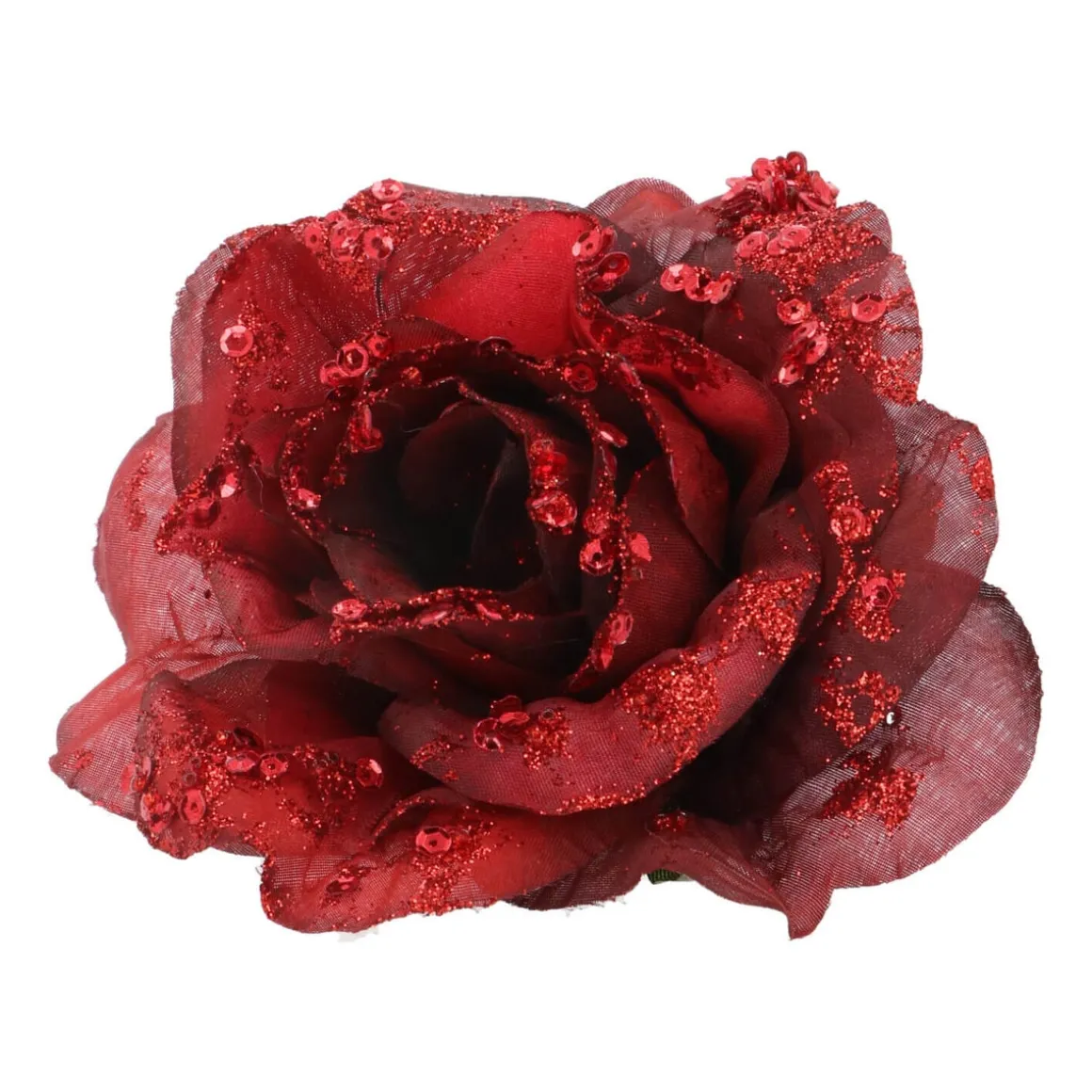 Dekorative Rose für den Weihnachtsbaum in Bordeaux. Einfache Befestigung mit praktischem Clip. Mit einer Größe von 15 cm ist die Blume ein toller Eyecatcher. Die Rose ist zusätzlich mit Glitzer versehen, wodurch ihr Aussehen noch festlicher wird.