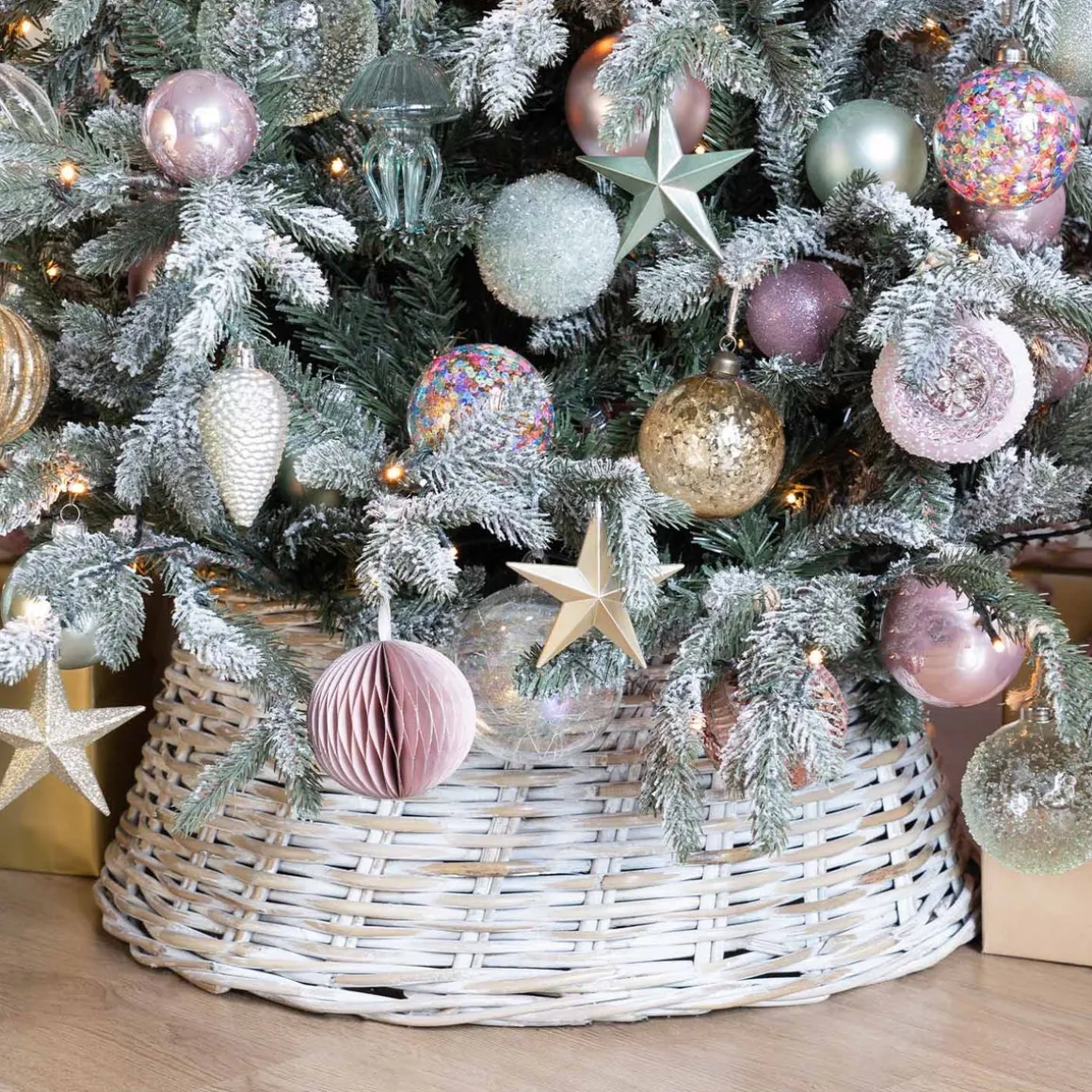 Dank der neutralen Optik aus natürlichem Rattan und leichter Weißfärbung lässt sich diese Weihnachtsbaumständerabdeckung zu jeglichen Farben von Christbaumkugeln kombinieren und fühlt sich außerdem in jedem Wohninterieur zuhause. Damit wird der Weihnachtsbaumrock zur Aufwertung für das Gesamtbild jedes Weihnachtsbaums.
