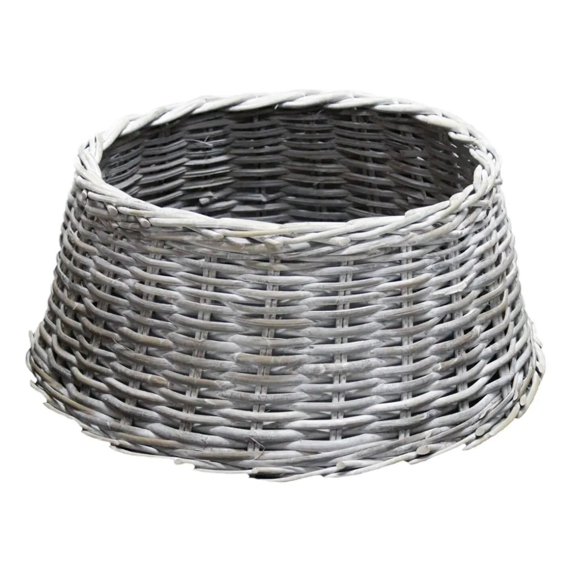 Der Weihnachtsbaumkorb hat unten einen Durchmesser von 60 cm und ist 26 cm hoch. Geflochten ist er aus runden Rattantrieben, wodurch er einen robusten Aufbau erhält.