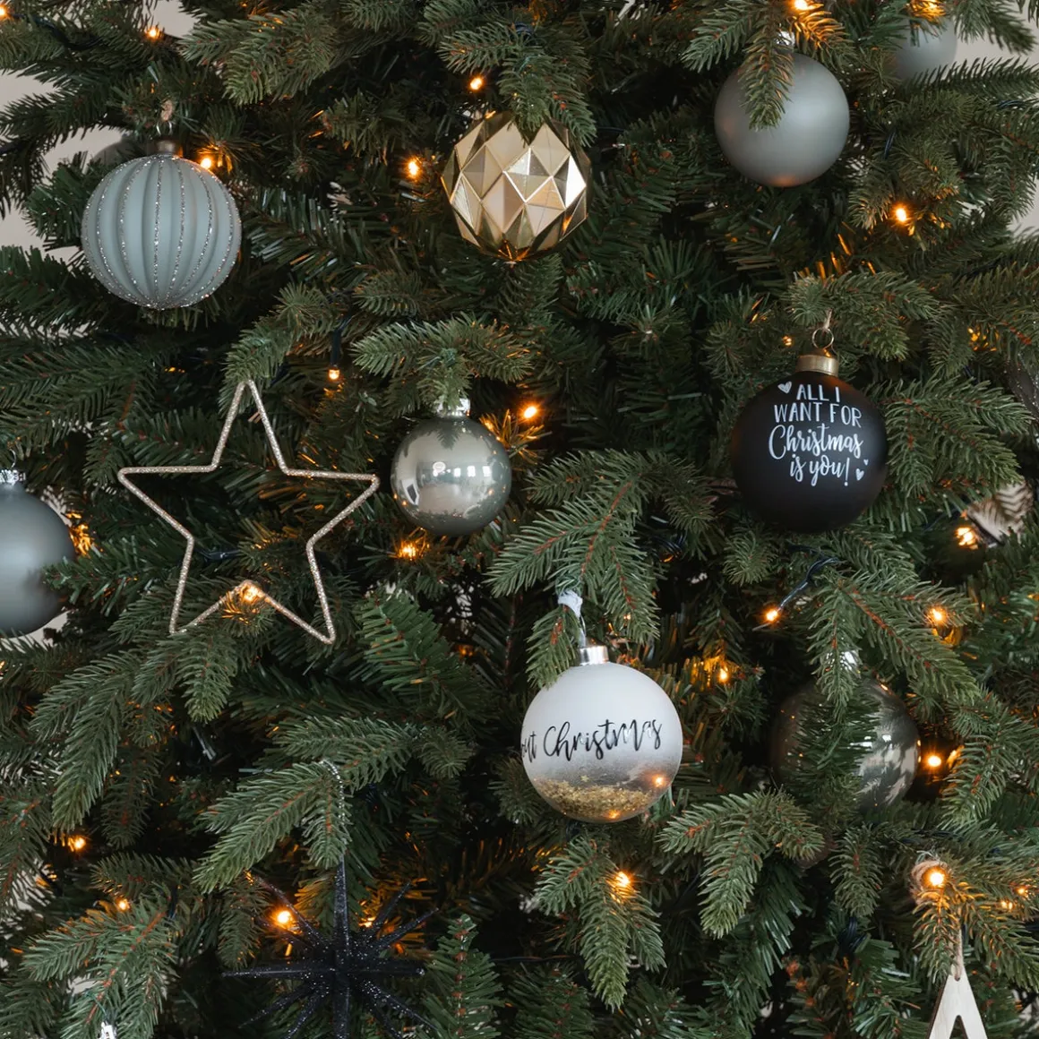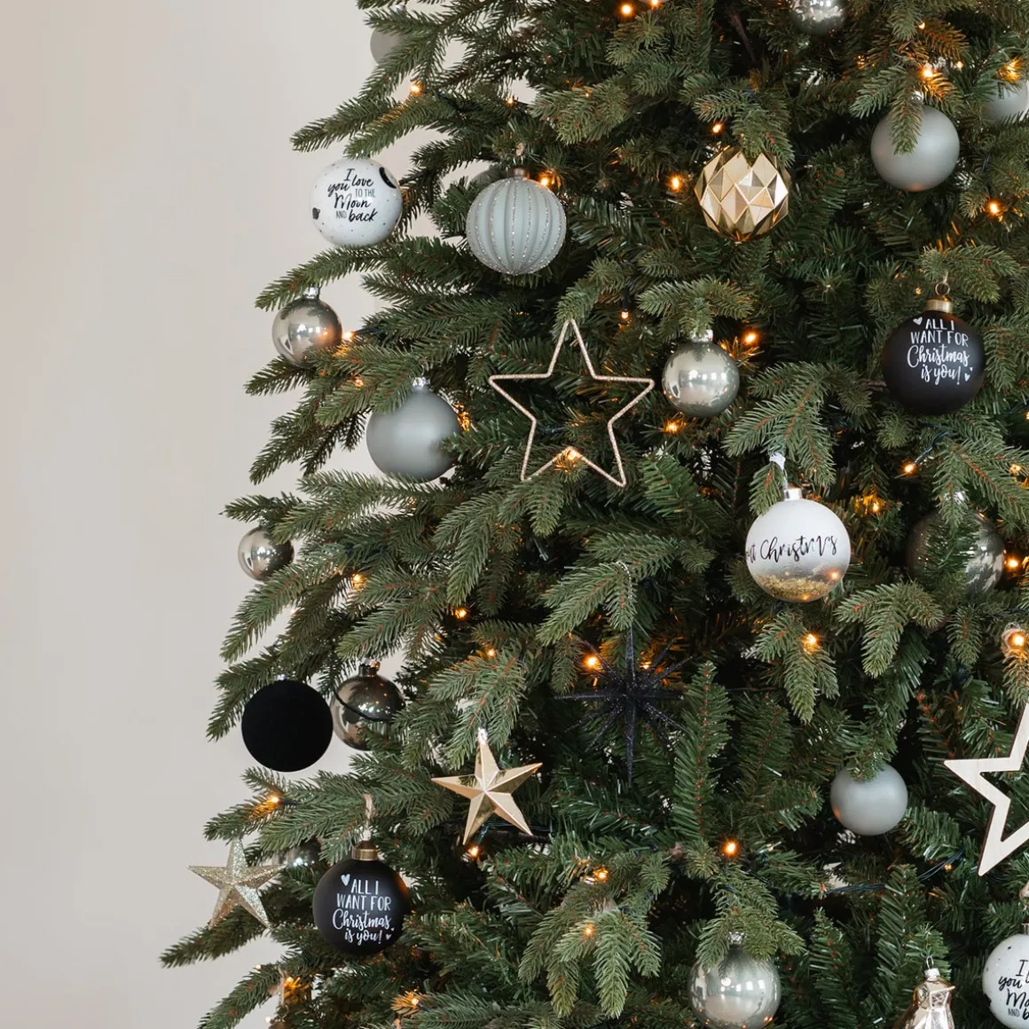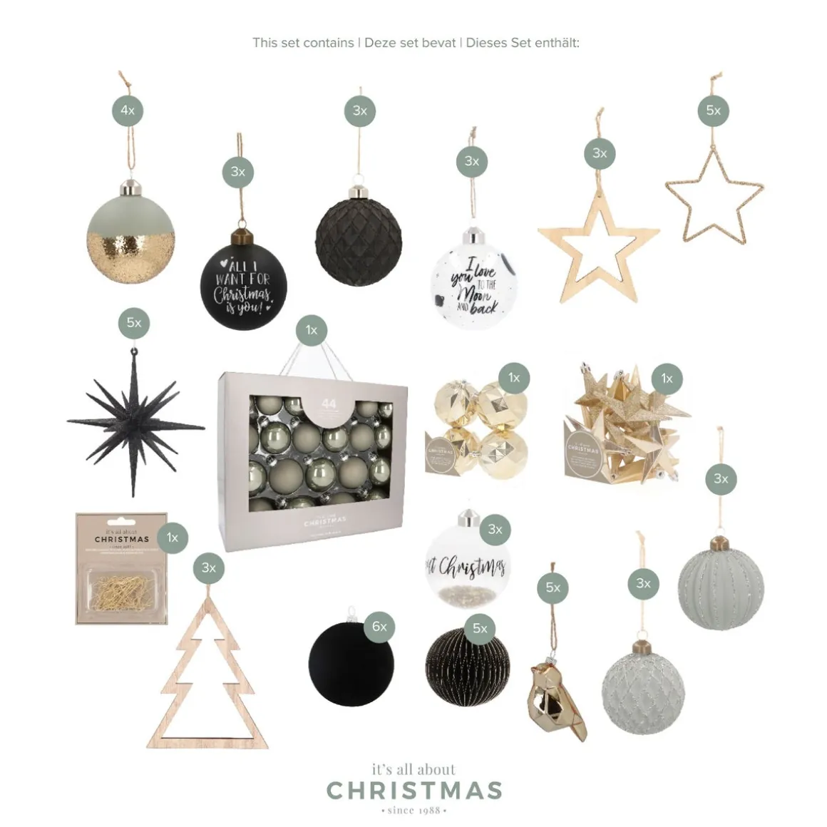 Dieses Set kommt besonders gut in einem modernen Interieur zur Geltung, in dem Einfachheit und ein klares Design im Mittelpunkt stehen. Unser Designteam lässt schwarze Weihnachtsornamente und geometrische Muster die Hauptrolle spielen. Frische Farben wie Weiß und Cottage Green sorgen für einen schönen Kontrast. Außerdem verleiht die Mischung aus Glas, Holz und goldenen Akzenten dem Baum das typische warme Gefühl der Feiertage. Das Ergebnis? Ein eleganter Weihnachtsbaum, der sowohl modern, luxuriös als auch festlich wirkt!