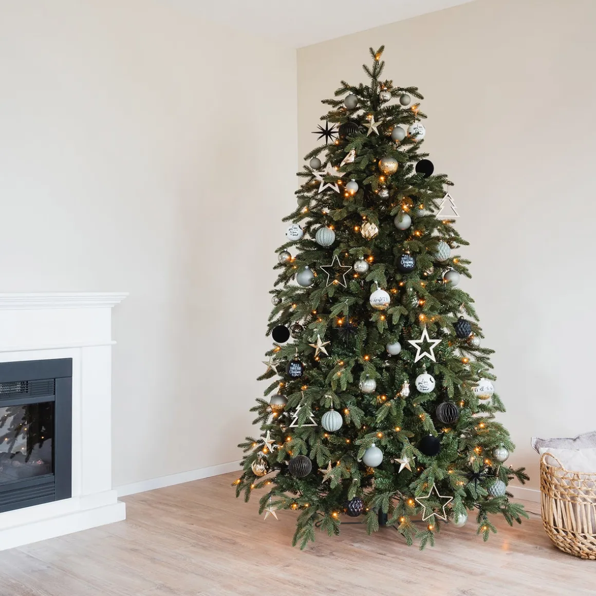 Dieses Weihnachtsbaum-Dekorationsset ist für Bäume von 1,70 m bis 2,40 m geeignet. Für das Foto hat unser Team einen Kunstbaum von 2,15 m verwendet.
