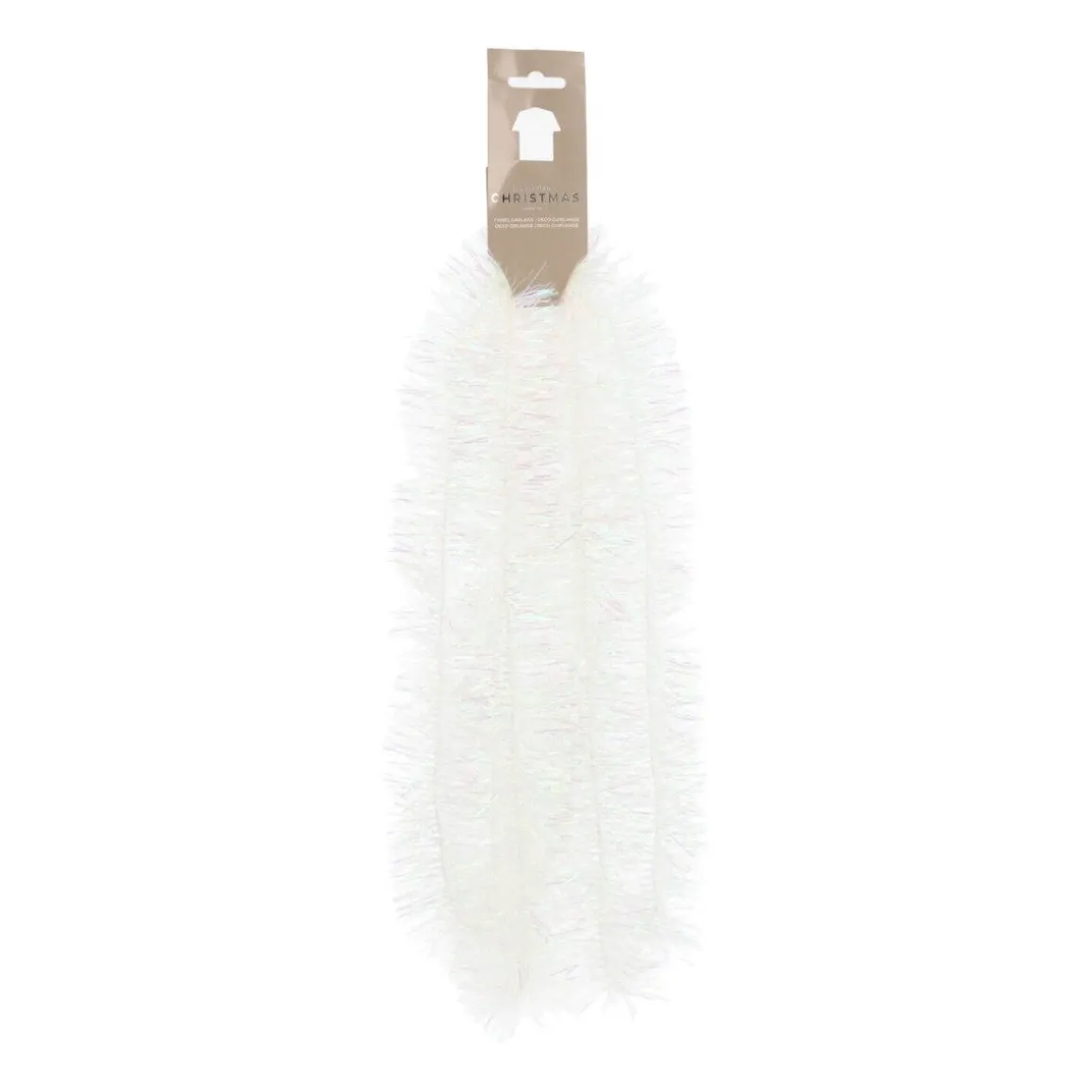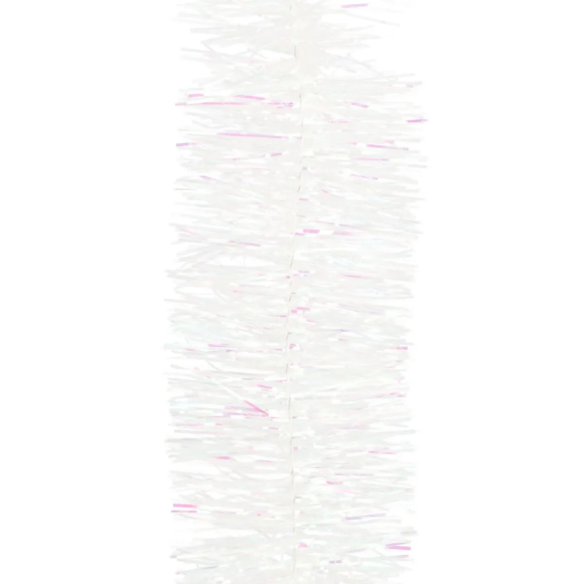 Elegante Weihnachtsgirlande in transparentem Irisweiß. Die Girlande ist 270 cm lang und hat eine Breite von 7,5 cm. Sehr dekorativ im Weihnachtsbaum oder aber an anderen Stellen. Weihnachtsgirlanden sind ein wahrer Klassiker zum Fest und wieder stark im Kommen.