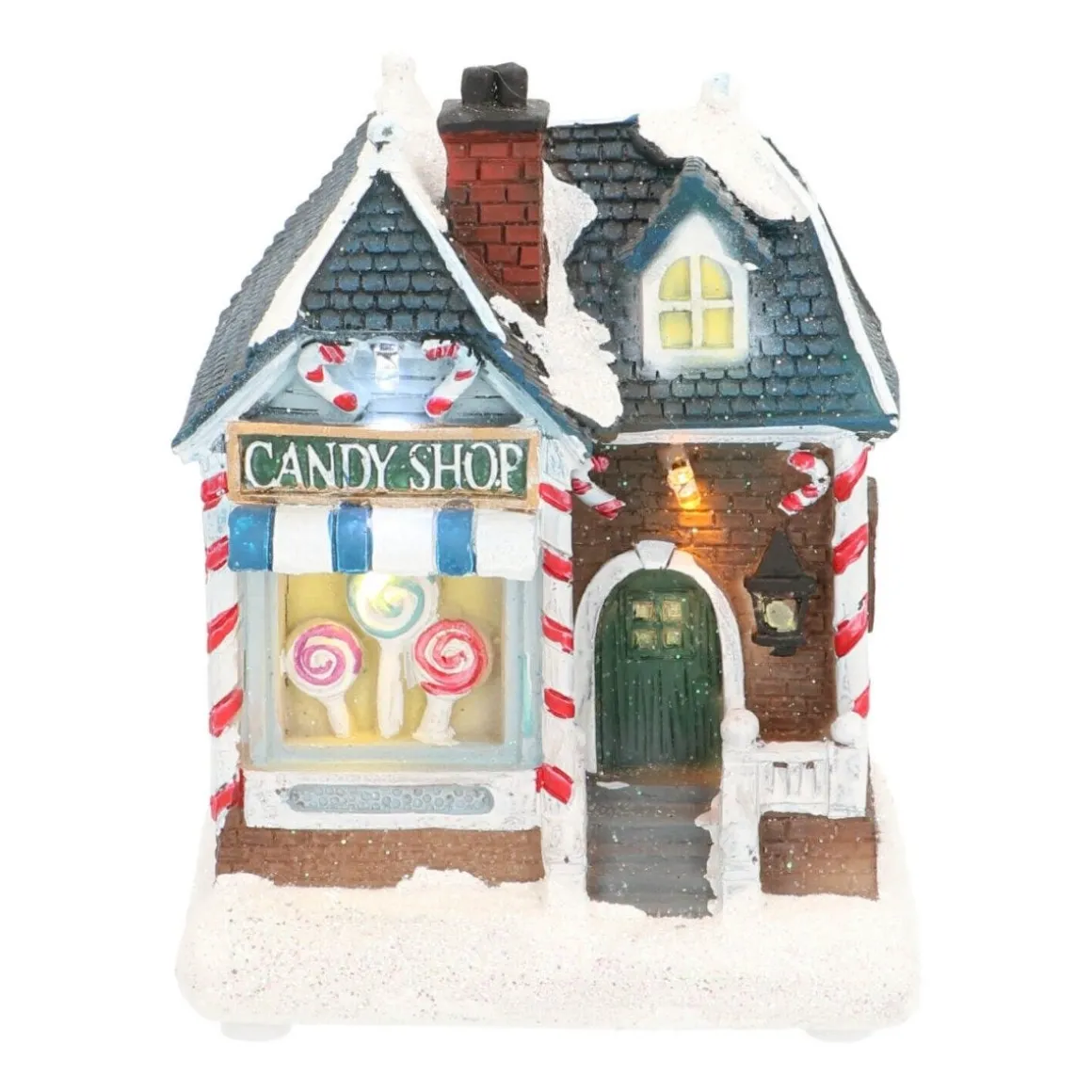Das Haus mit brauner Fassade wird von rot-weiß Säulen getragen, ganz im Zuckerstangen-Look. Im Schaufenster laden übergroße Lutscher zum Eintritt ein. Candy-Shop steht in großen Lettern geschrieben, damit auch der Letzte weiß, welch schöner Laden sich hier verbirgt. Ein graues Dach, teils mit Schnee bedeckt, rundet einen perfekten Süßwaren-Laden ab.