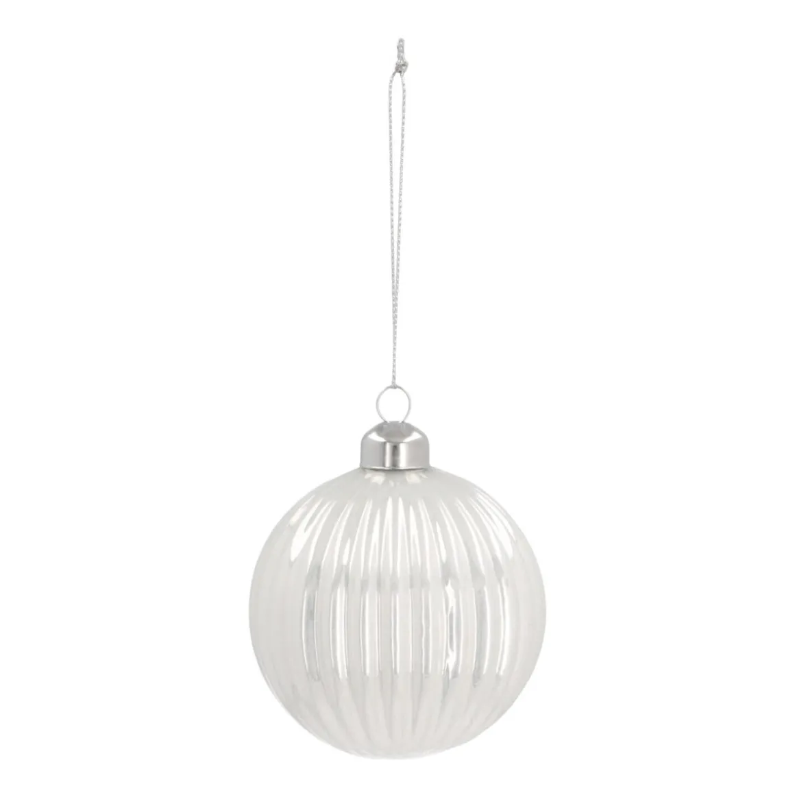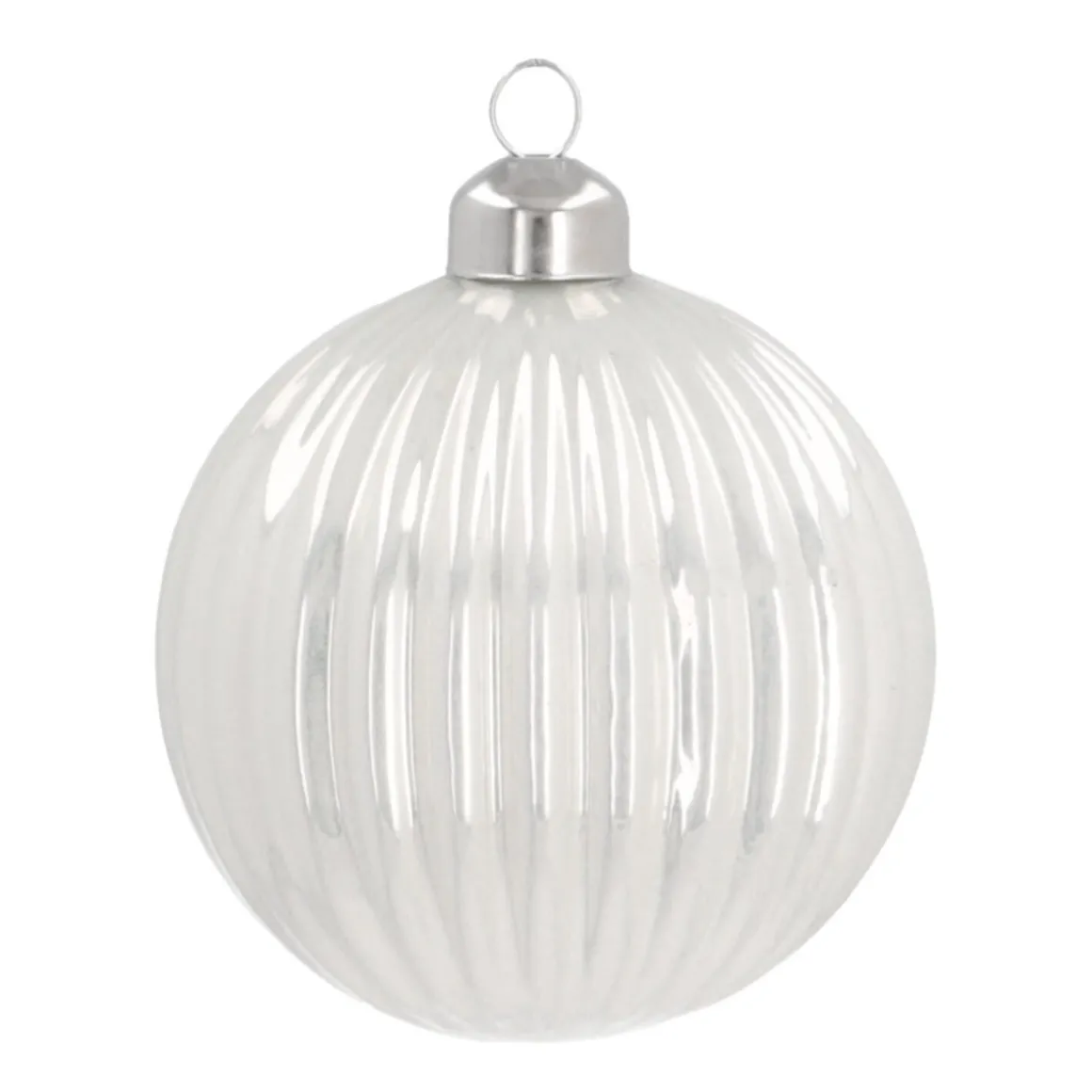 Außergewöhnliche Weihnachtskugel aus Glas im Lampion-Design. Die 8 cm große Christbaumkugel ist Weiß gehalten. Mit ihrem dezenten Aussehen wird sie zum Gewinn für jeden Weihnachtsbaum und lässt sich darüber hinaus mit allerlei Farben kombinieren.