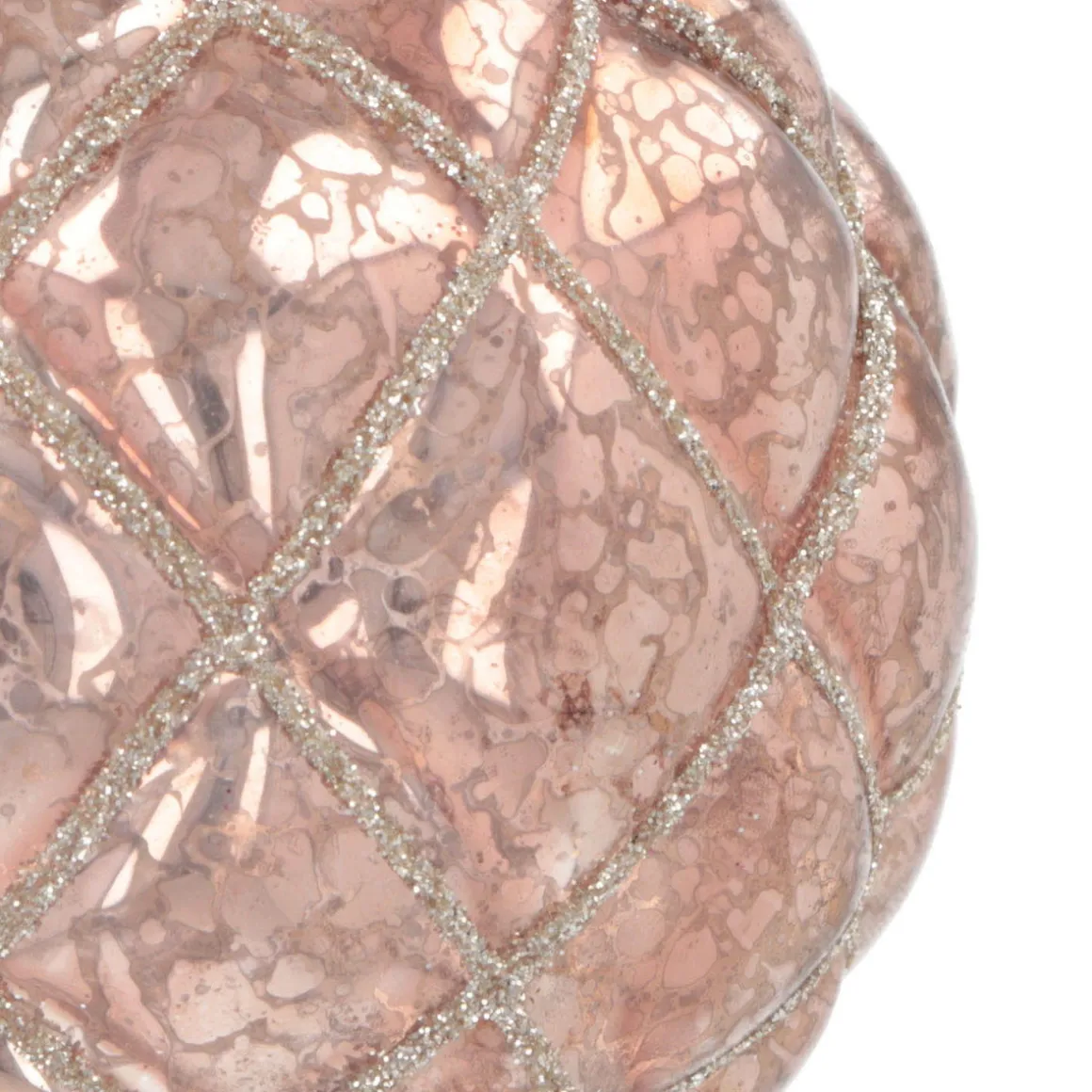 Klassische Eleganz strahlt diese besondere Weihnachtskugel aus Glas aus. Auf der altrosa Oberfläche mit Rautenmuster befindet sich ein Krakelee, das einen gewissen Vintage-Charme zum Ausdruck bringt. Silberne Glitzerlinien werten das Design wiederum auf.