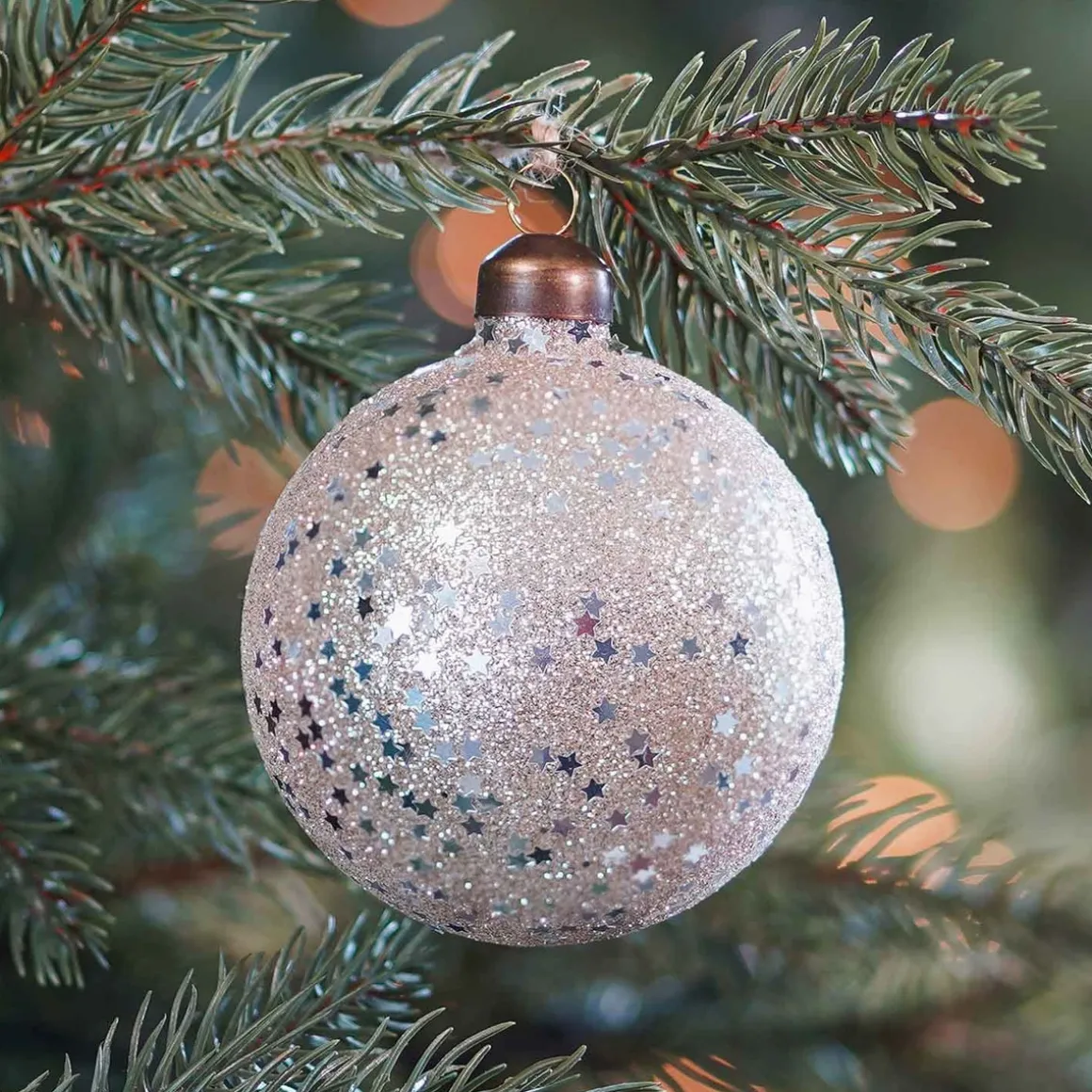 Bezaubernde Weihnachtskugel mit Sternchen dekoriert, hergestellt aus echtem Glas. Die 8 cm große Christbaumkugel hat eine glänzende, champagner-farbene Oberfläche, die Deko-Sternchen sind silber. Klar, dass diese Kugel für ein funkeln am Tannenbaum sorgt! Überdies besitzt sie ein Juteband zum Aufhängen.