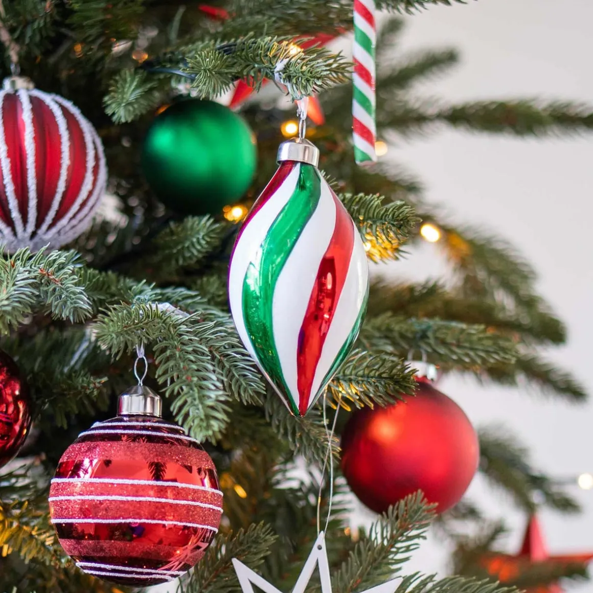 Rot, Weiß und Grün sind Farben, die wir traditionell zu Weihnachten wiederfinden. Insbesondere wenn wir an amerikanische Weihnachten denken, ist diese Farbkombination in der Weihnachtsdeko gang und gäbe. Deshalb passt die ovale Kugel auch sehr gut zu Weihnachtsthemen und Designs, in denen die USA aufgegriffen werden.
