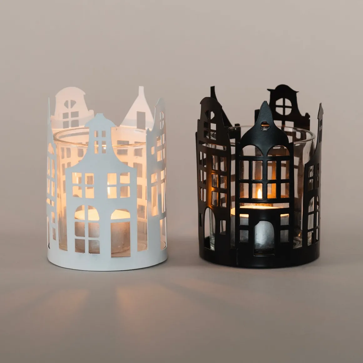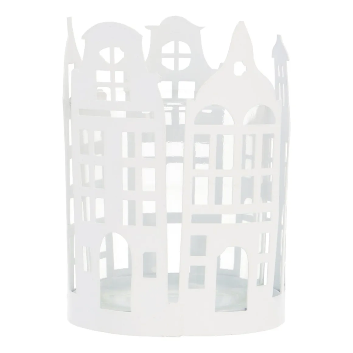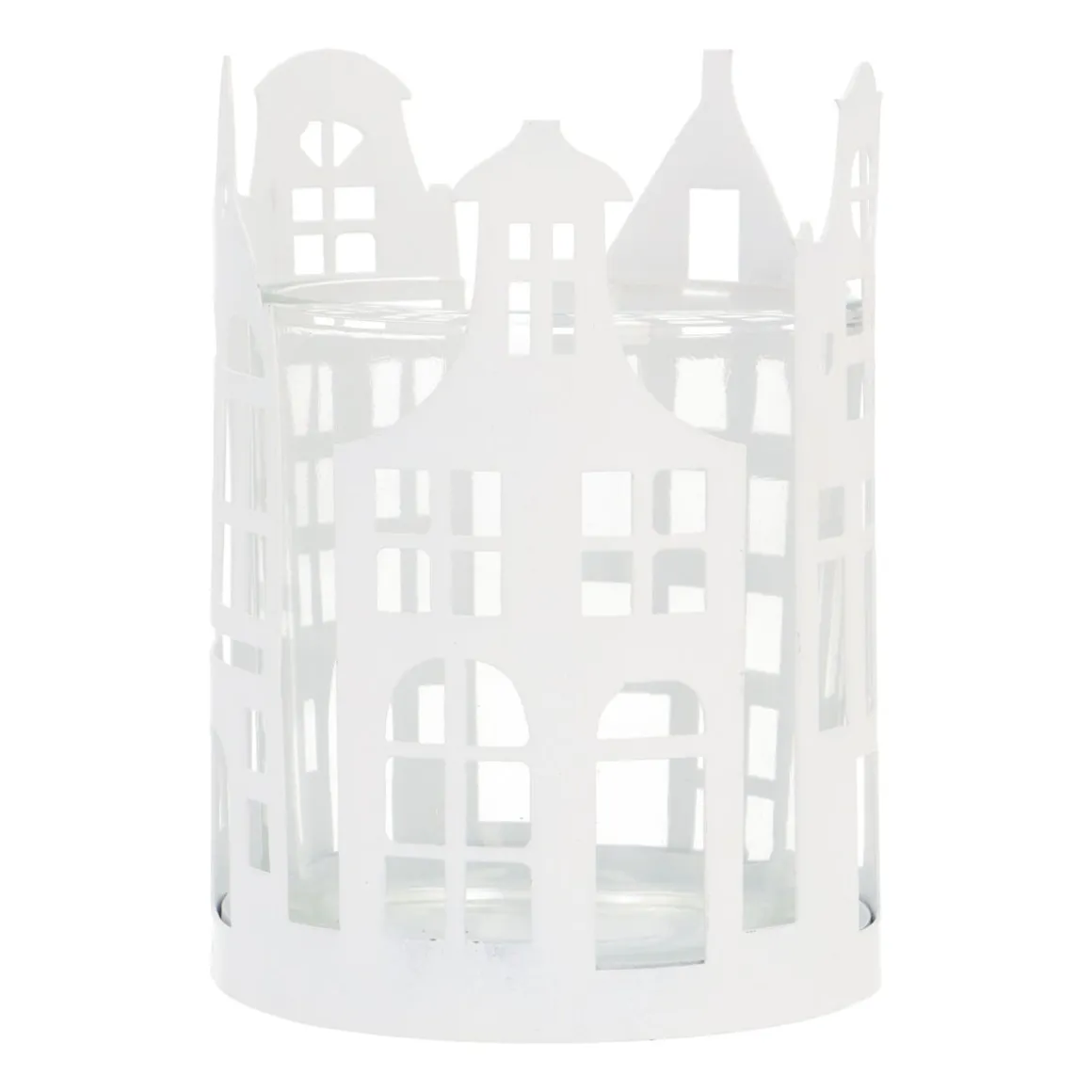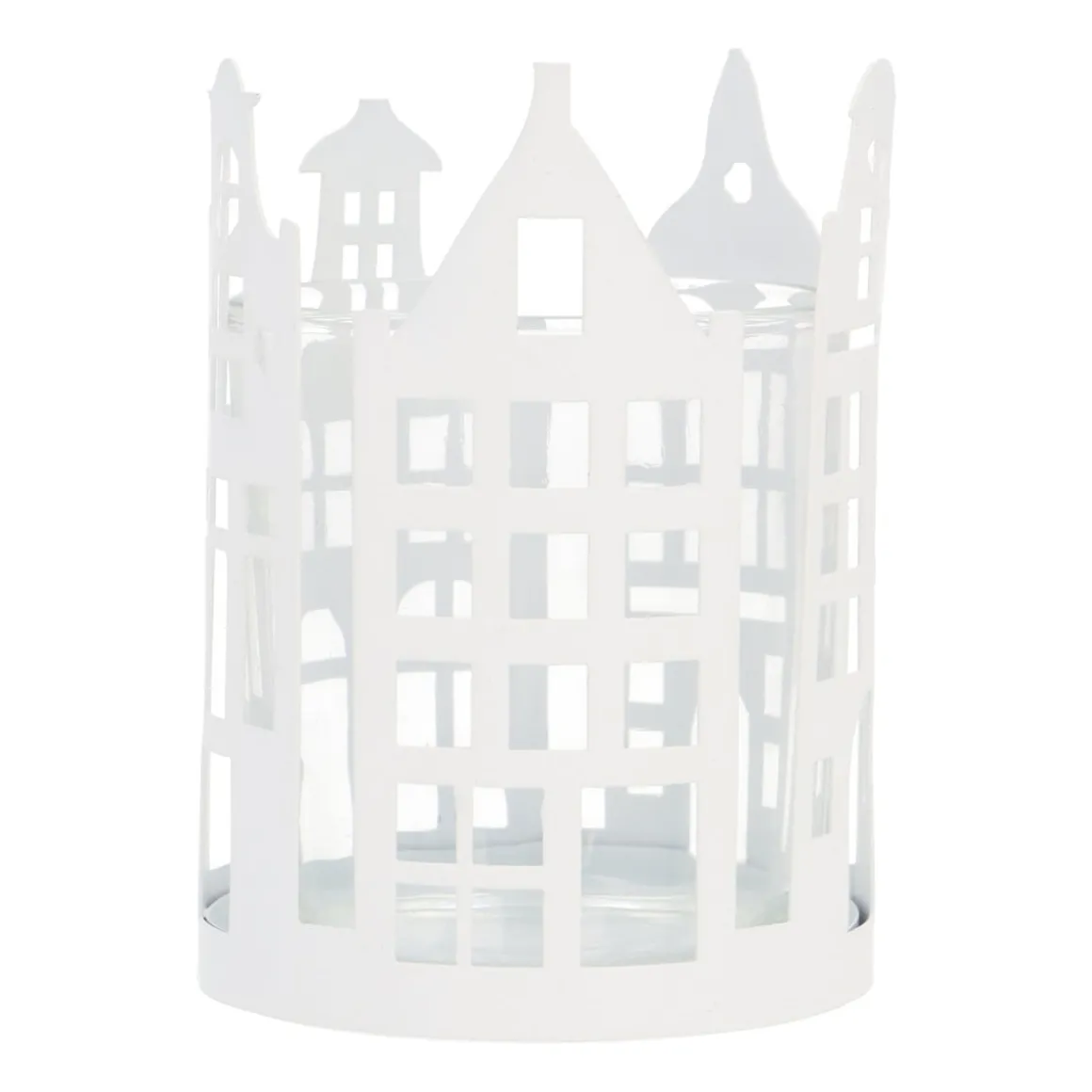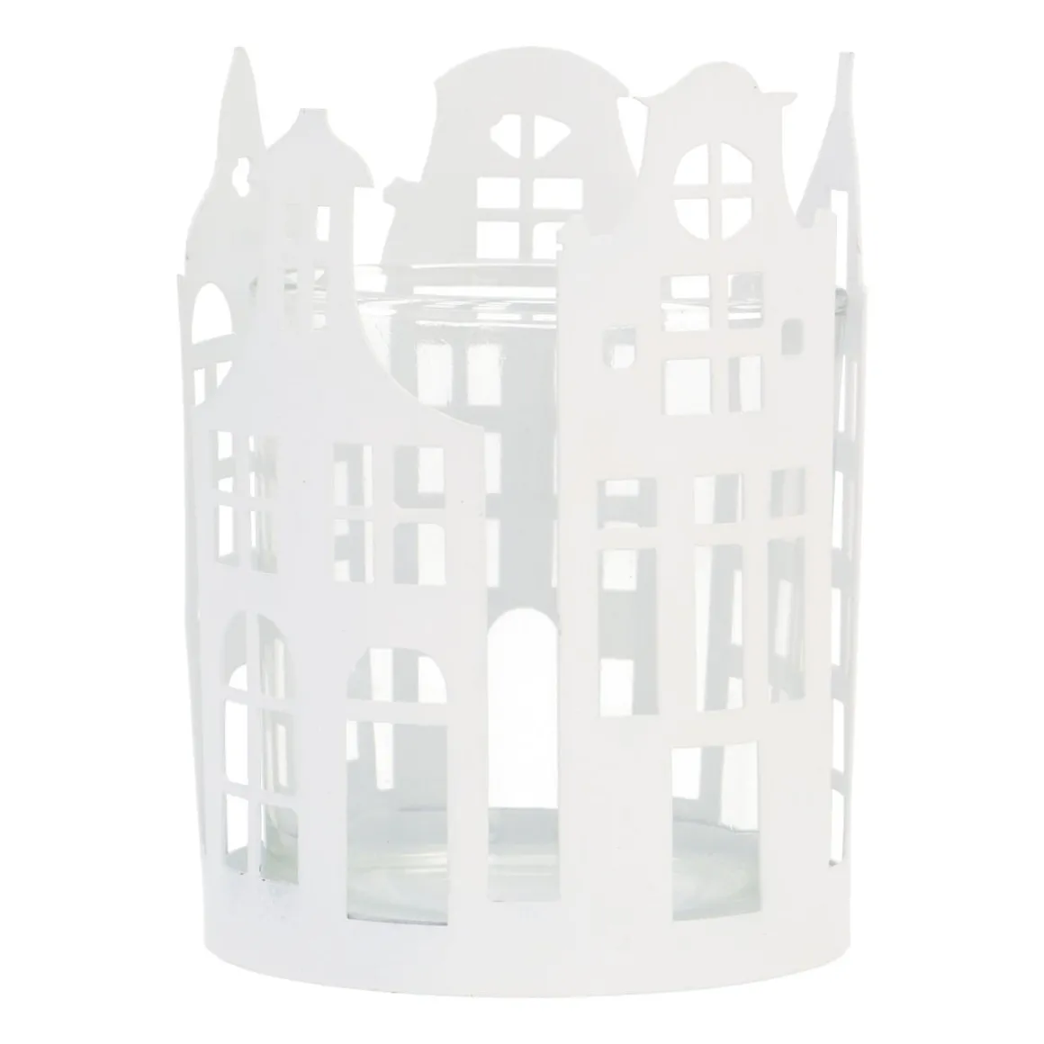 Bringe den Charme der städtischen Grachten zu dir nach Hause mit diesem stimmungsvollen runden Teelichthalter. Hergestellt aus Metall und Glas, umgeben die detaillierten Grachtenhäuser das Kerzenlicht und erzeugen ein wunderschönes Schattenspiel, wenn die Kerze brennt. Mit einem Durchmesser von 7,5 cm ist dieser Teelichthalter perfekt für eine gemütliche Ecke auf der Fensterbank, dem Tisch oder dem Kamin.