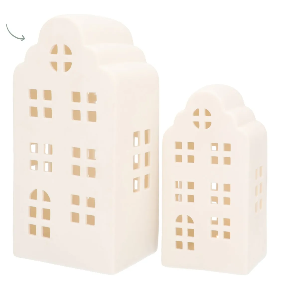 Hol dir eine Portion holländischen Charme ins Haus mit diesem 20 cm hohen Grachtenhaus. Dieses stilvolle weiße Häuschen mit abgerundeten Ecken ist aus mattem Porzellan gefertigt und hat ein schlichtes, minimalistisches Design, das zu jedem Stil passt. Sobald du das warmweiße LED-Licht einschaltest, strahlt das weiche Licht gemütlich durch die Fenster. Ideal, um deine Fensterbank, deinen Weihnachtstisch oder dein Sideboard während der dunklen Dezemberabende extra gemütlich zu gestalten. Die Batterien sind bereits enthalten, du kannst es also sofort aufstellen!
